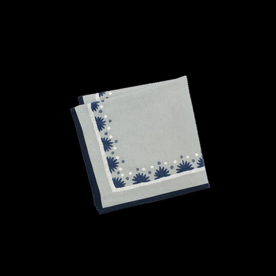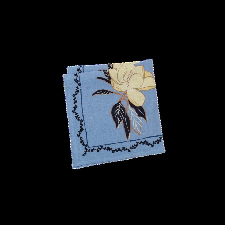 Our dinner napkin for the collection features a line drawn bougainvillea floral print with an embroidered trim motif found throughout the collection of linens and glassware. Sold in sets of 4, 20x20 inches in size