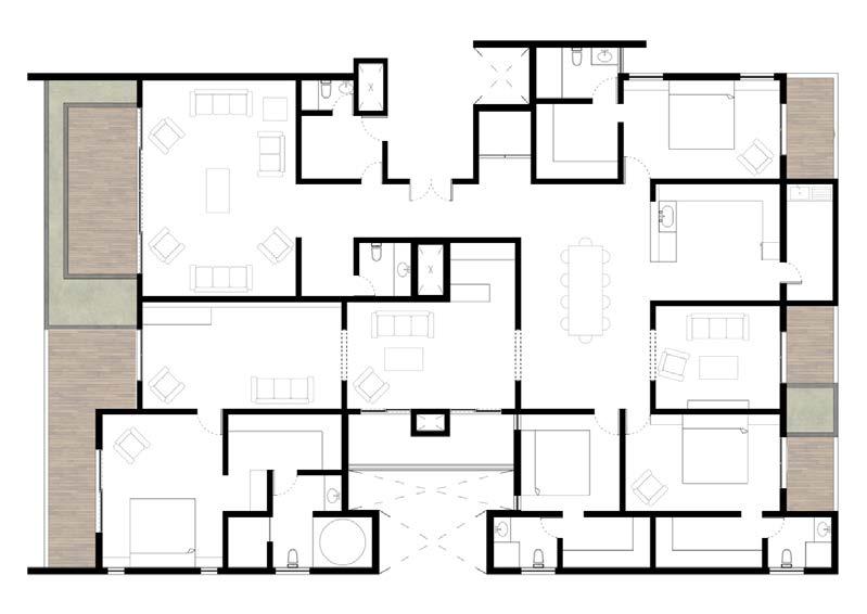 The floor plan of the block is designed to allow free movement for the inhabitants while also bringing as much greenery as possible.