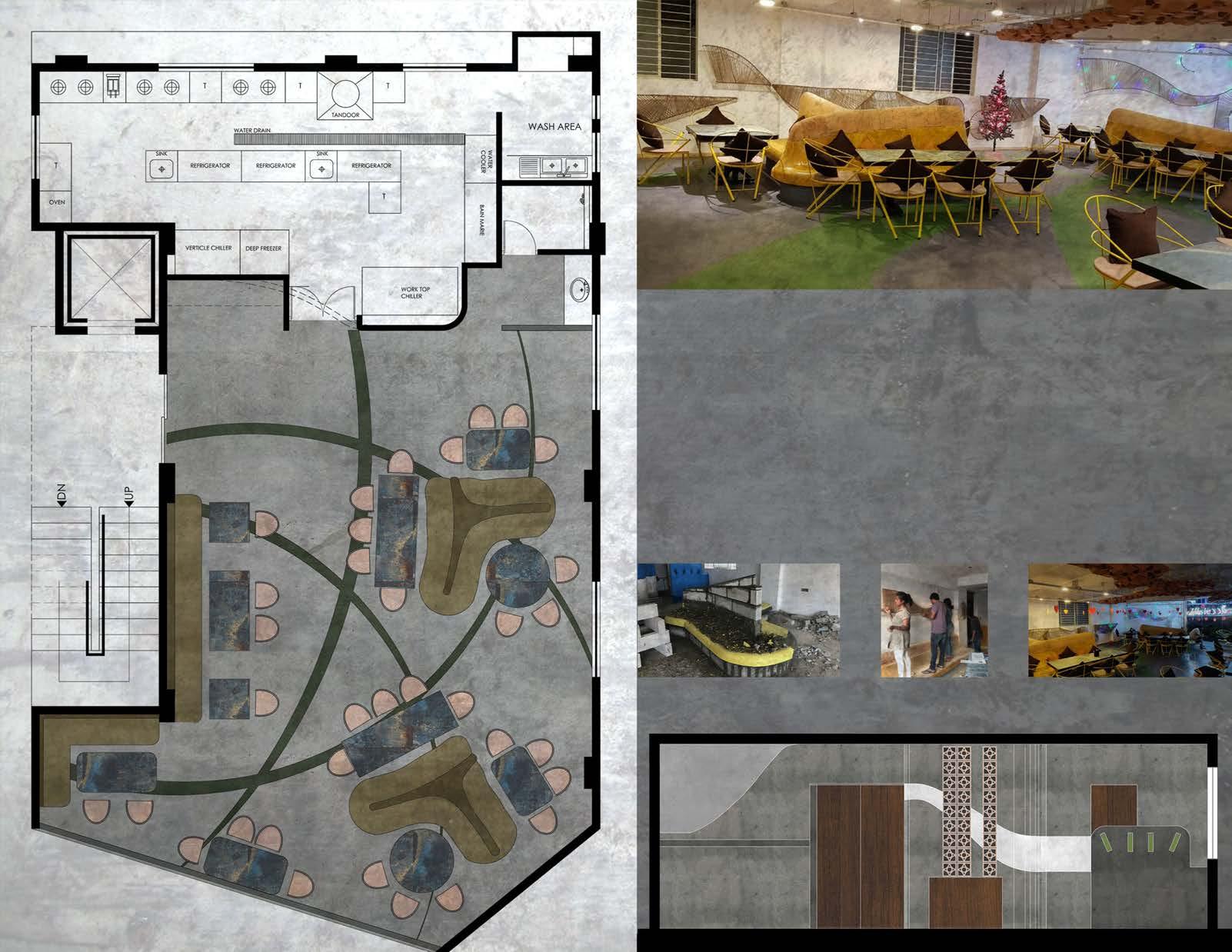 In this project the cafeteria tries to bridge the gap between the outside and the inside and this is achieved by the open walls and the slender columns that allow for a greater see-ability of the outside.