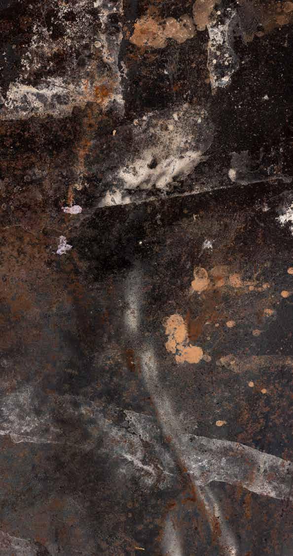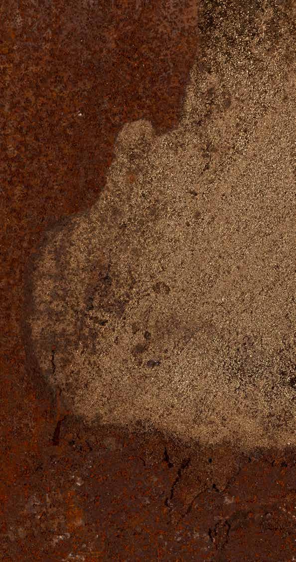 Sovereignty over Country and all its riches, lies at the heart of Fielding’s practice. Fielding is well known for interventions made to found objects, as well as assemblages of these items into ambitious displays including Untitled 2018 or Holden on 2022. His works Kultuni (spear right through) 2021 (p.37, 49) extends this notion and responds to the non-consensual policing of Indigenous bodies and resource exchange through unequal power dynamics. Intent on rendering a claim of strength and resilience, Fielding edits the history of the object away from an uninvited colonial regime by literally spearing through the racist legacy of paying Indigenous peoples their hard-earned rations in only flour, sugar, or tea. Those who controlled the rations, controlled the narrative. The way in which Fielding restores these works is multiple: the sandblasted patterning of the objects reveals a beating transcription of the unknowable. As the artist himself explains: