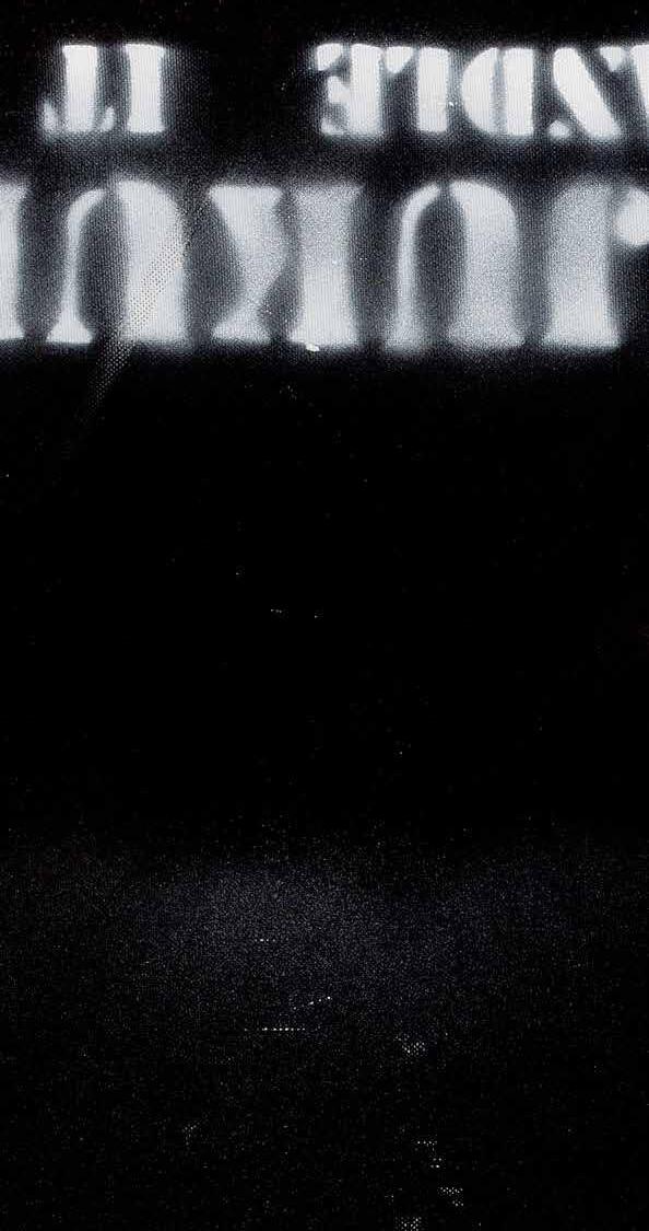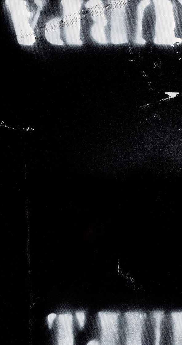 In works such as Tutu 2022, (p.21) Tutu 2022, (p.93) Yalta 2022 (p.97) and Paralpi 2022 (p.19), opacity is embodied by Fielding’s technique of overpainting; his purposeful enshrouding of text to control the conditions of the viewer’s visibility. Across the works, landscape gives form to word, and word becomes landscape. But, as the scene is barely legible, our brains feel unsure of which should lead to fill in the void. We must decide if a letter is to become the contour of a mountain, or if a tree branch is just the shape of shadows. This element is key to anchoring viewers into a scene of tension where slippages of knowledge move between transparency and opacity; where Fielding is the grandmaster revealing and concealing sacred knowledge and that which should be kept from view. This is a fine example of how Fielding mobilises source material to regain control, to tell what is true.