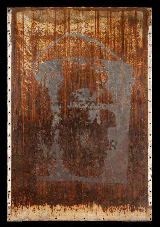 reclaimed water tank panel with sand blasted alterations, 170 × 122cm