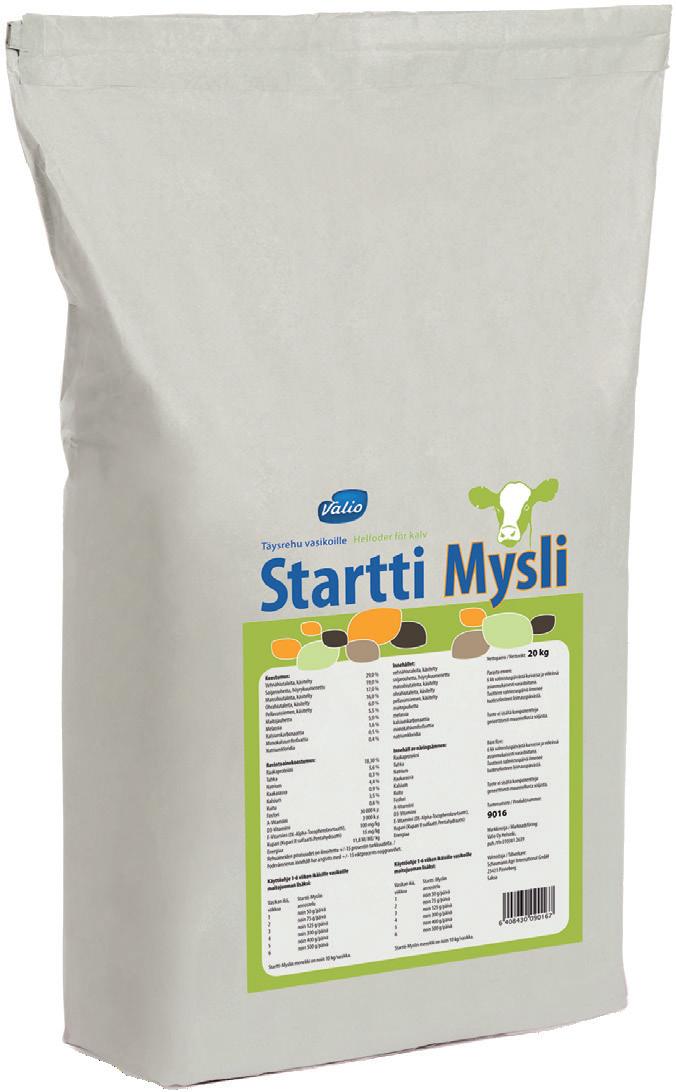 Startti Myslissä on kaikki. Se korvaa muut väkirehut. Ensimmäisten viikkojen aikana lisäksi tarvitaan vain vettä ja vapaasti karkearehua. Mitä ennemmin vasikka oppii syömään