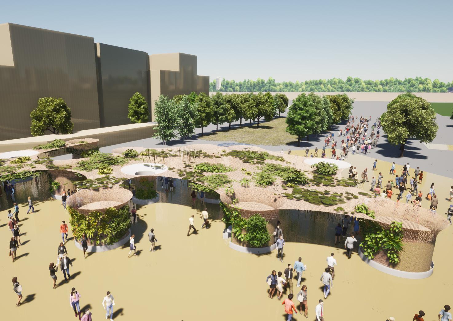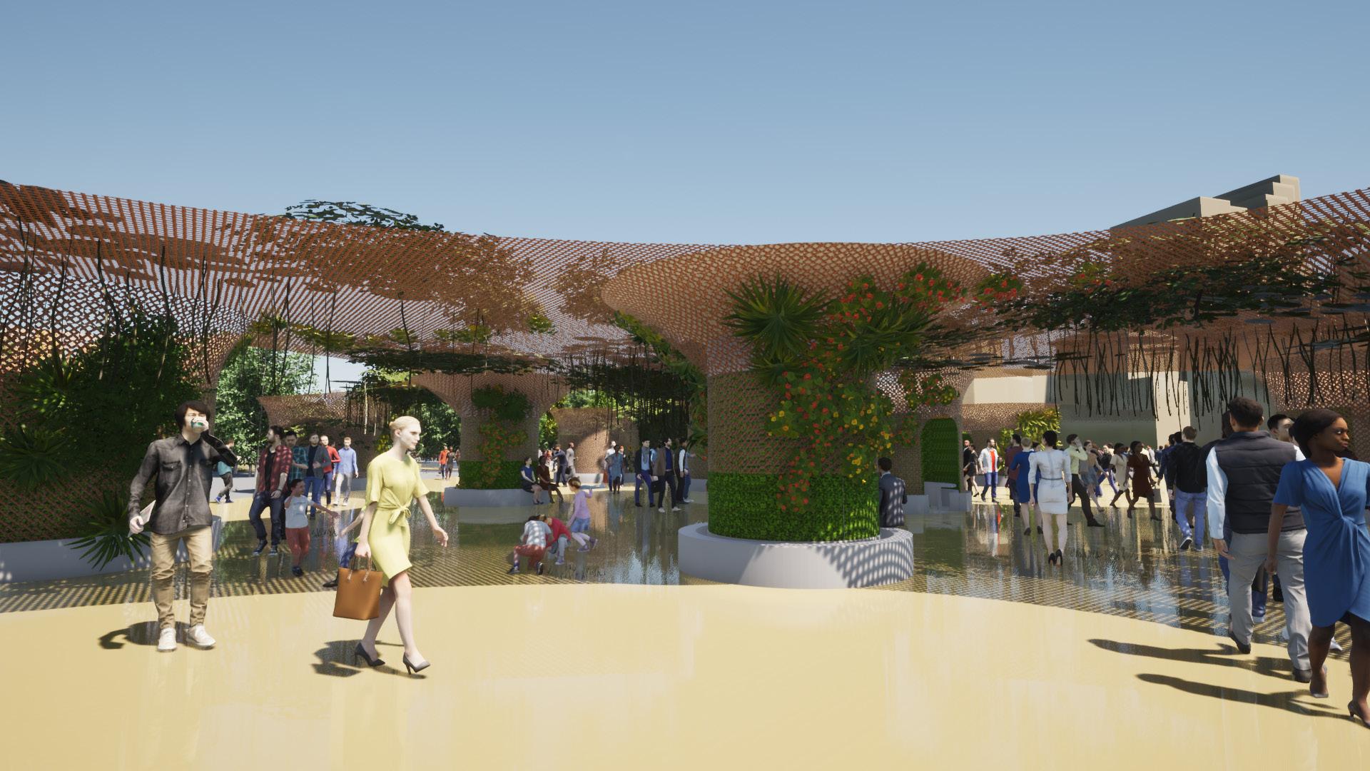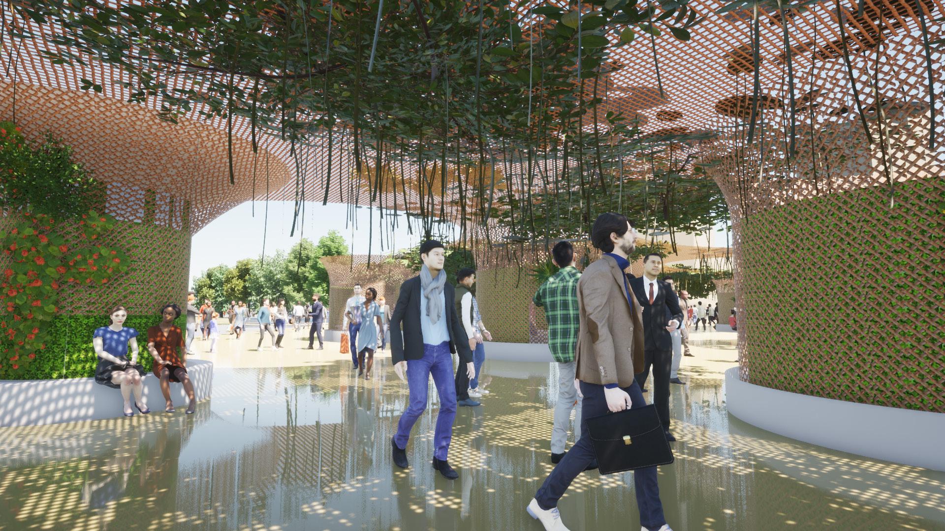 Cette installation a été pensée comme une canopée multifonction , le but étant de végétaliser la place de la Comédie à Montpellier , sur le long terme. La structure et la végétation sont un ensemble autosuffisant , qui répond à des besoins d’ombrage, et d’infrastructures sur une grande place vide. La climatisation naturelle par les végétaux, la récupération d’eau, les assises et les espaces de rencontres et de détentes, font de « l’oasis » un lieu incontournable de la ville de Montpellier.