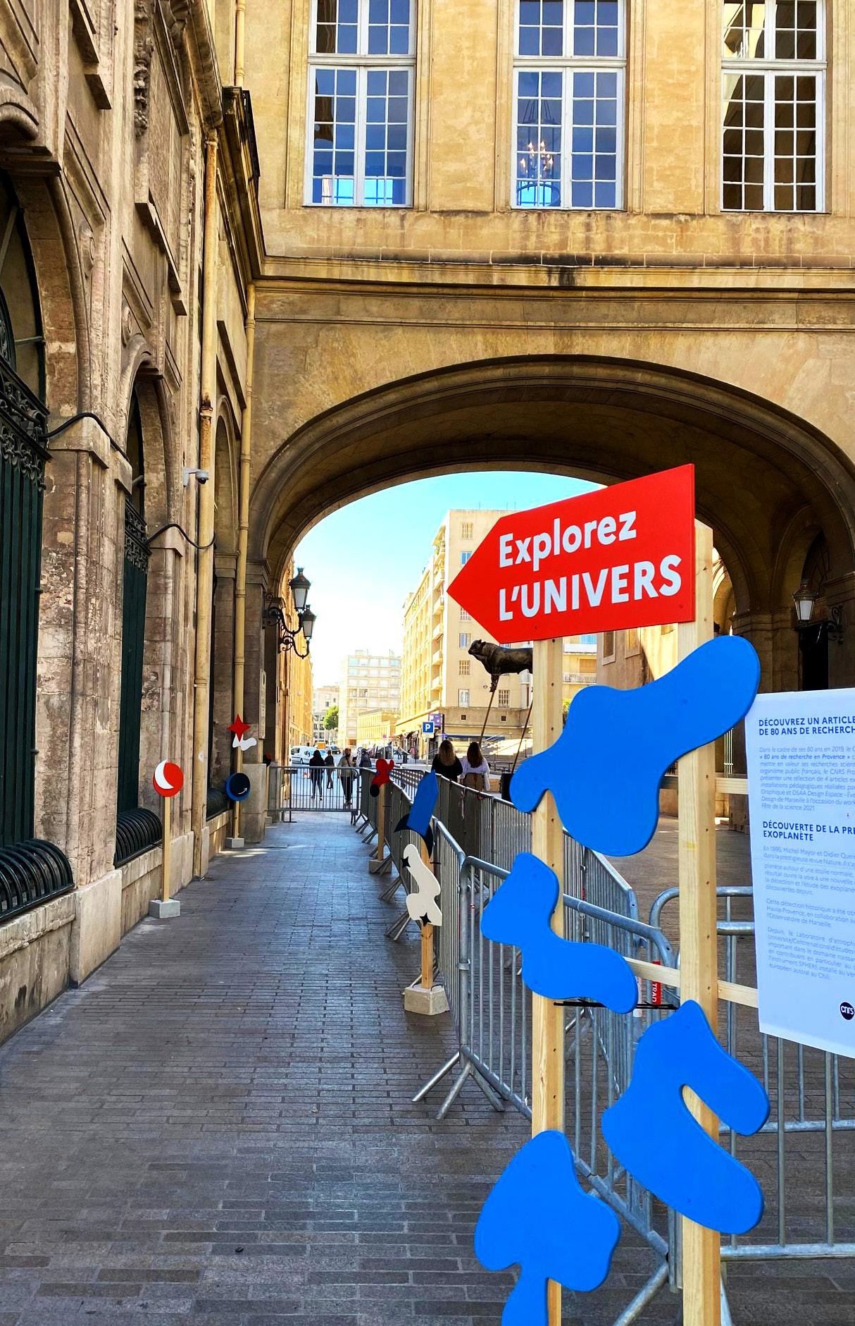À l’occasion de la Fête des Sciences 2021 de Marseille , l’association Les Petits Débrouillards et l’agence Jaune Sardine nous ont missionnés pour la conception et la réalisation d’une la signalétique de l’événement. Nous avons imaginé des panneaux didactiques et interactifs menant vers l’exposition « Explorez l’univers ! » . Après un temps d’atelier, nous avons installé les dispositifs sur la place Villeneuve Bargemon. Projet signalétique en collaboration avec Chloris Jourden et Agatha André-leloup.