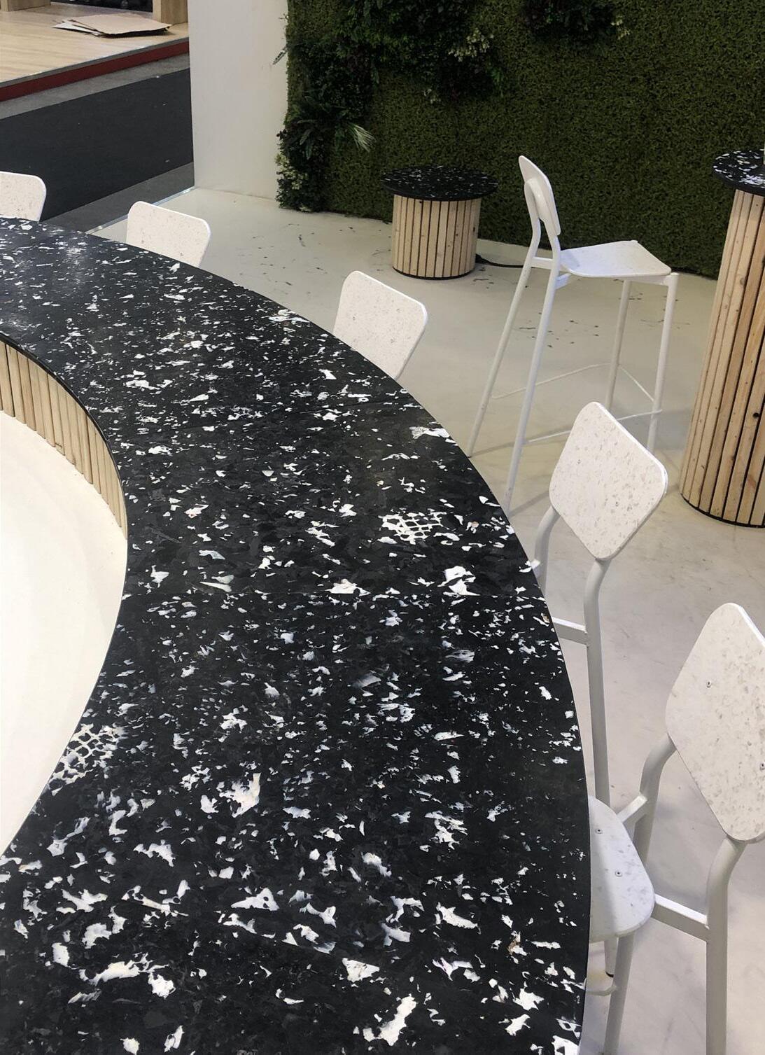 Une scénographie de stand qui se veut écoresponsable, dans un domaine du design souvent très polluant. Cet événement éphémère a été pensé avec des matières de récupération, du plastique recyclé et du mobilier loué. Miki Nectoux avec qui je travaille et moi-même avons créé un ensemble d’éléments fort dont l’originalité s’est démarquée lors du salon Sirha 2023. On notera le revêtement du bar en cagette de marché (plastique recyclé) PP noir et blanc en lien avec l’activité du commanditaire Creno.