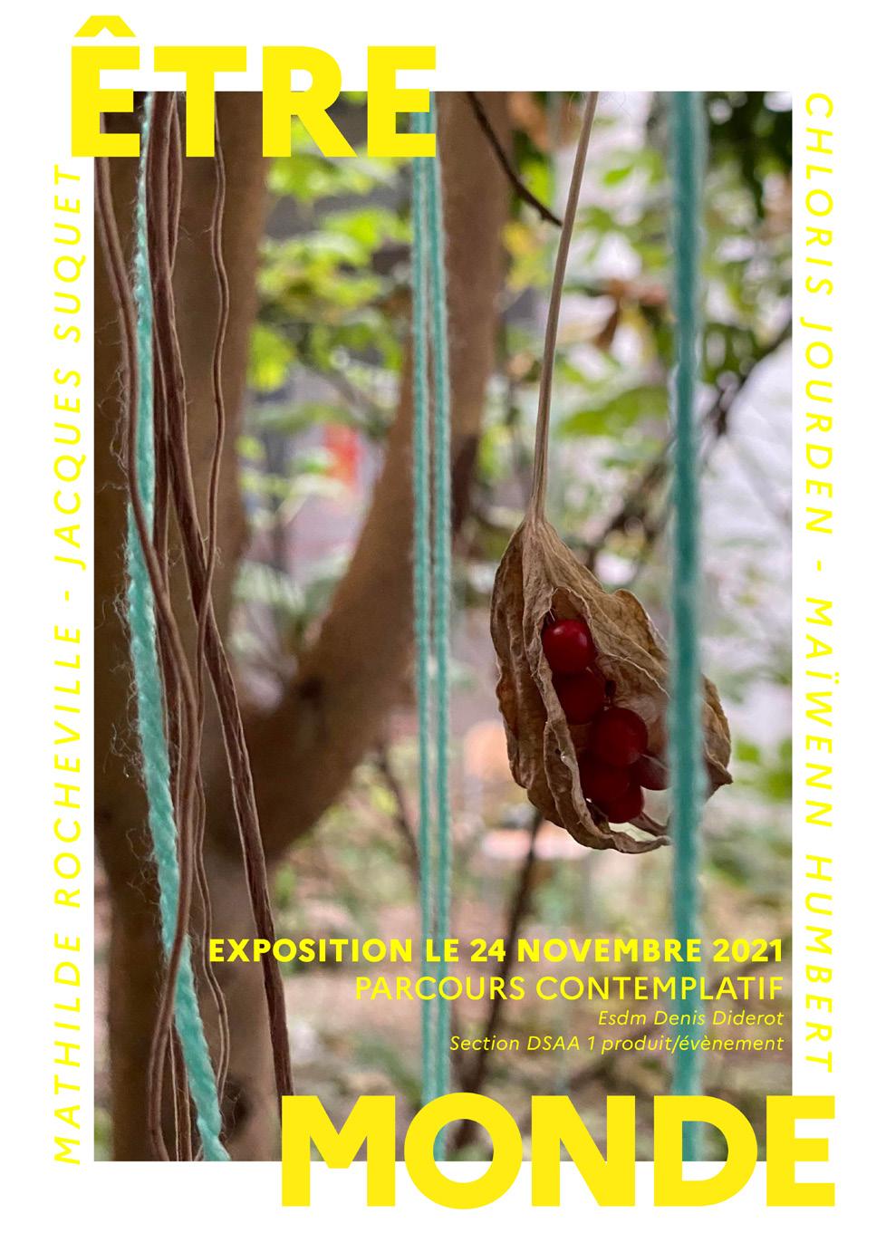 L’exposition “être monde, parcours contemplatif” est une invitation à l’observation attentive de notre environnement . Dans le parcours guidé d’un plan, les œuvres exposées sont à trouver et plus encore à inventer. Le but est de les chercher, et de laisser aller son regard aux petites choses qui l’entourent. Le dessin peut permettre à l’esprit de considérer plus intensément les détails . L’œuvre en elle-même est un simple fil de laine vert éclatant, qui peut symboliser la mainmise de l’homme sur la nature. Il est disposé de manière à épouser les formes végétales, mais il est surtout un prétexte pour amener le visiteur à la contemplation . Exposition en collaboration avec Mathilde Rocheville et Chloris Jourden.