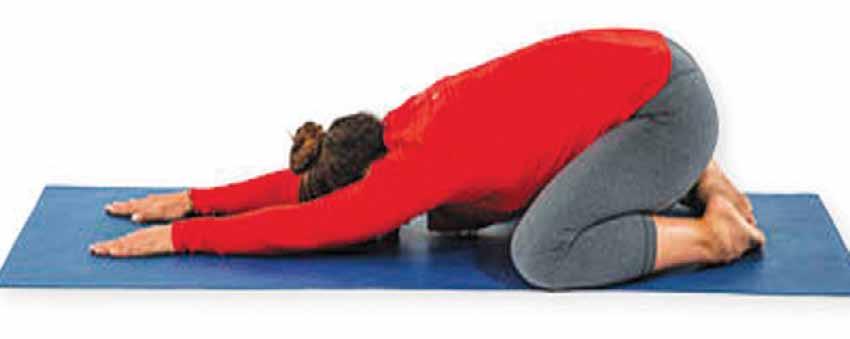 Get on all fours, knees hip-width apart, with your big toes touching. Slowly drop your buttocks back toward your heels as you extend your hands in front of you and rest your forehead on the mat. Feel the stretch down your arms, shoulders, and back. Hold for 10 to 30 seconds. Return to the starting position and repeat the process three times.