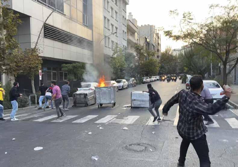 In this Tuesday, Sept. 20, 2022, photo taken by an individual not employed by the Associated Press and obtained by the AP outside Iran, protesters throw stones at anti-riot police during a protest over the death of a young woman who had been detained for violating the country’s conservative dress code, in downtown Tehran, Iran.