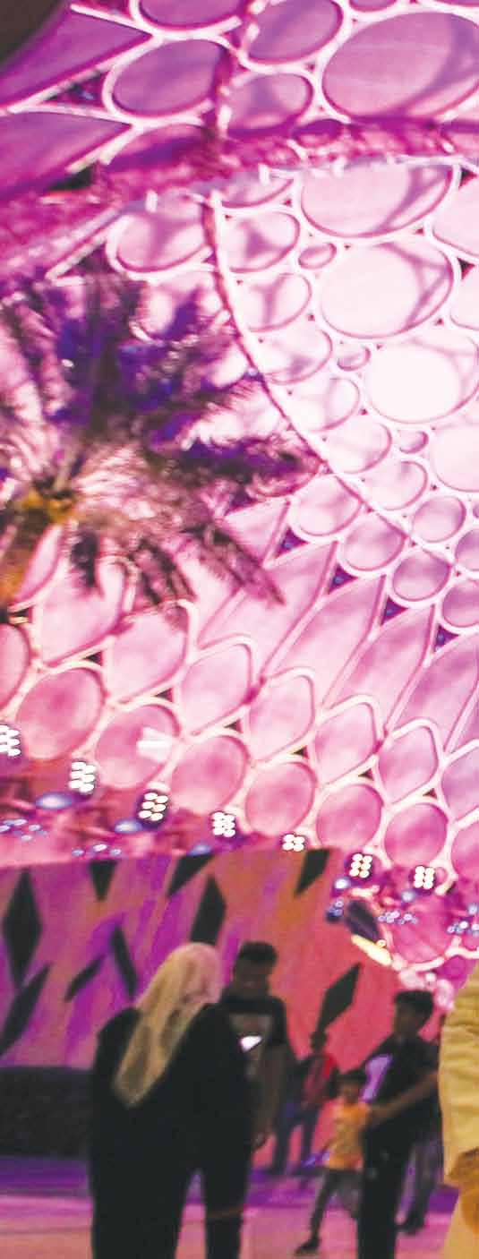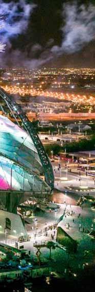 day. The façade puts on a colorful light show at night. The stadium’s sides reach up and envelop the pitch, keep ing the arena cool thanks to an advanced cooling system. Other unique elements near the stadium include murals installed on the outside which were created by aspiring local artists and capture the spirit of football.