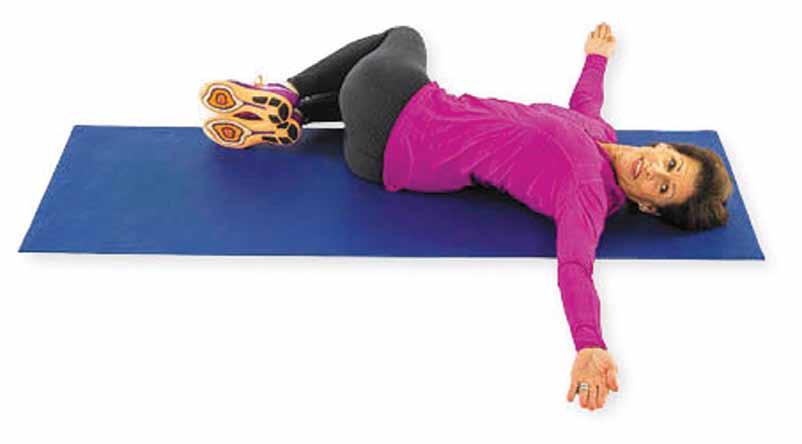 Lie on your back on a bed or the floor, with your knees bent and feet together. Put your arms out to each side at shoulder level, palms up. Tighten your abdominal muscles, lift both knees toward your chest, then lower them together to the left side on the floor. Keep your shoulders relaxed and pressed into the floor. Look in the opposite direction, and feel the stretch across your chest, torso, lower back. and hip. Hold 10 to 30 sec onds. Bring both knees back to center, then re peat the stretch on your right side. Repeat the exercise three times.