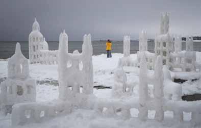 A woman takes a photograph of snow castles which were built by local residents at the Pirita Beach on the Baltic Sea in Tallinn, Estonia, Tuesday,