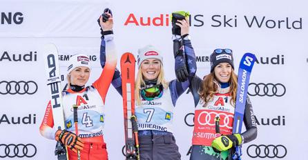 La gagnante des États-Unis Mikaela Shiffrin (première rangée, 3L) célèbre sa victoire avec les membres de l’équipe sur le podium, après l’épreuve de lalom géant de la Coupe du monde féminine de ski alpin FIS, à Semmering, en Autriche, le 28 décembre 2022. (AFP)