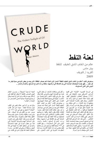 عالم من الخام :الشق العنيف للنفط بيتر ماس ألفريد أ .كنوبف 2009 يستعرض كتاب "عالم من الخام :الشق العنيف للنفط" الدمار الذي أحدثه أحد مصادر الطاقة ،الذي يعد من بعض النواحي مميتًا بقدر ما هو مفيد . ..فهو يفسد المجتمعات البدائية التي يتم اكتشافه في أراضيها ،مخلفًا وراءه الصراع المسلح ،والفساد والدمار .. البيئي على أعلى المستويات في الرواية القصيرة "اللؤلؤة" التي كتبها الروائي األمريكي جون شتاينبك في عام ،1947يصطاد الغطاس المكسيكي الفقير كينو لؤلؤة هائلة الحجم من قاع روافد أحد الخلجان .ويحلم كينو بالثروة الضخمة التي ستجلبها له هذه اللؤلؤة ،و التي ستنقذه من الفقر المدقع الذي يعيش فيه هو وأسرته .ولكن هذه اللؤلؤة تدفع جيرانه من القرويين إلى التخطيط لسرقتها .و كما كتب شتاينبك في روايته ،فقد كان التأثير الذي أحدثته هذه اللؤلؤة مثل التأثير الذي يحدثه السرطان في جسد المريض .فهي خلقت "نوعا من الشر األسود الخالص ....الذي حفز غدد السم في البلدة لكي تبدأ في تصنيع السموم ،بحيث تضخمت البلدة الصغيرة و انتفخت ،مثل جسد المريض ،تحت تأثير هذه السموم" .وتنتهي القصة بإعادة كينو اللؤلؤة إلى مكانها في قاع الخليج ،خوفًا من الدمار الذي سيلحقه به هو وأسرته. 05ديسمبر 2009