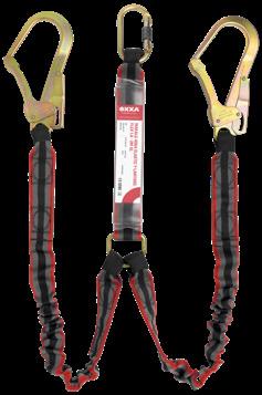 Deze energie absorberende kernmantel vanglijn bestaat uit: valdemper in 44 mm brede band, een 44 mm breed polyester elastische vanglijn, een stalen karabijnhaak met automatische vergrendeling en twee stalen steigerhaken met automatische vergrendeling