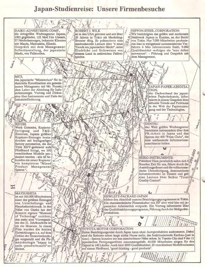 So viel Aufwand für eine 15-köpfige Reisegruppe, die gar nichts kaufen will? Wir erlebten es als Merkmal, wie Japaner überhaupt an Aufgaben und Probleme herangehen: mit Systematik und Sorgfalt, nichts dem Zufall überlassend. Sogar für Unvorhergesehenes war gesorgt. Als ein Teilnehmer die Busfahrt einmal verschlief, wurde ihm die Fahrtroute zur Firma Ricoh ins Hotel gefaxt, damit er mit dem Taxi nachkommen konnte (mit der Adresse allein ist in Tokio nichts zu finden) und bei einer Werksbesichtigung zerrissene Nylons einer Teilnehmerin wurden binnen einer Minute ersetzt - es war an alles gedacht.