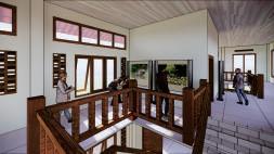 padagedungpertunjukankesenian dan bangunan pendukung pada ruang pameran dan ruang geleri seni Konsep ini menghadirkan salah satu bentuk fasad pada bangunan dengan menampilkan unsur kearifan lokal seperti batik khas Wonosobo dengan motif carica dan tanaman purwaceng Motifbatikiniakandiletakkanpada bagian fasad bangunan di setiap interior dan eksterior pada bagian sun shading atau shading device berfungsi sebagai peneduh dan secondaryskinpadabangunan.