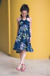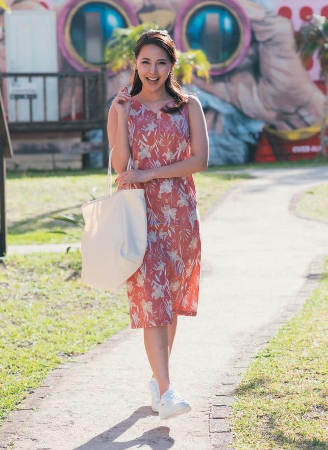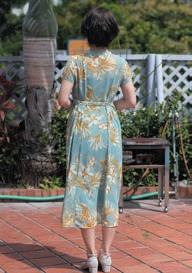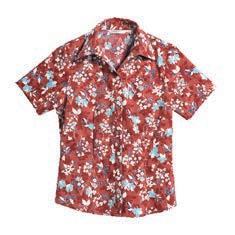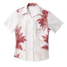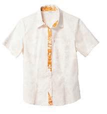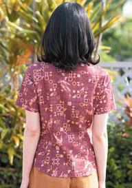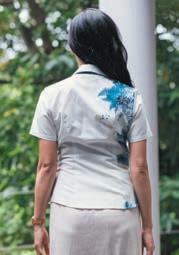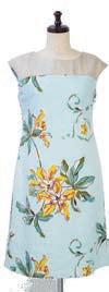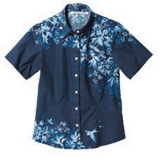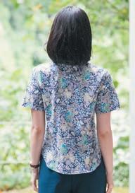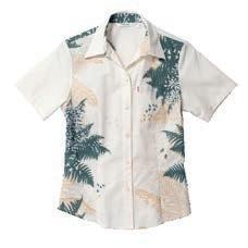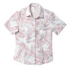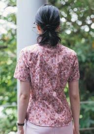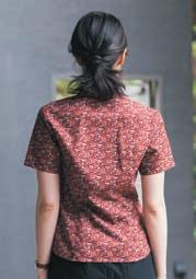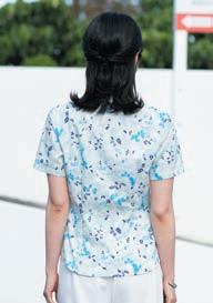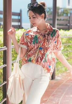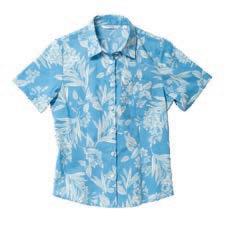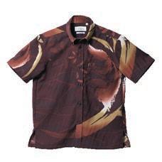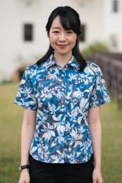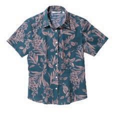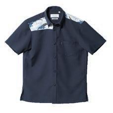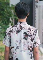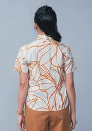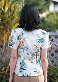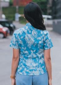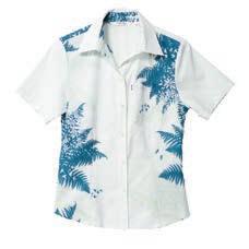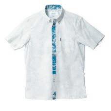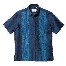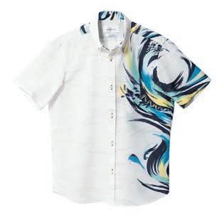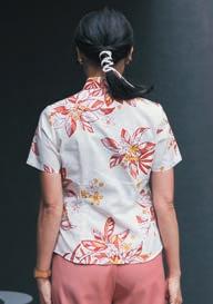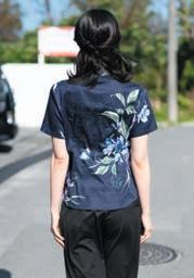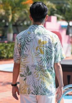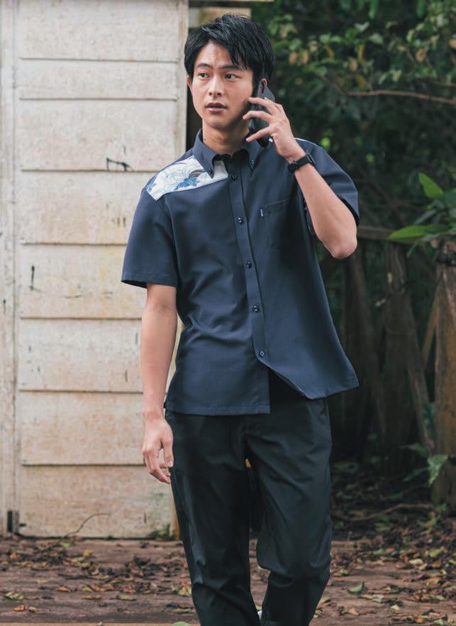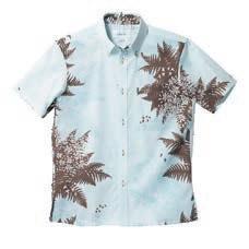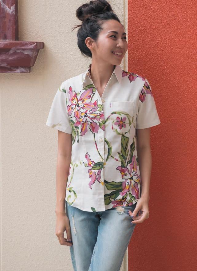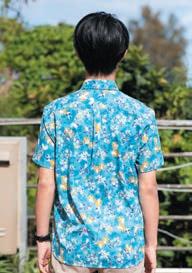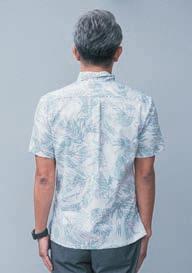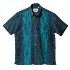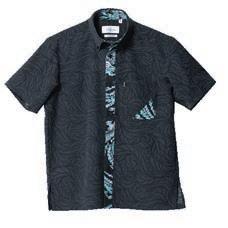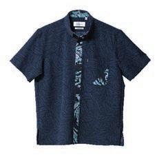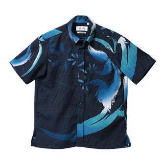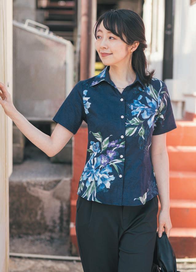 南国の植物が重なり合い、風に揺られて音を奏でているイメージをデザインして爽やかな 印象に。落ち着いた色合いに映える南国らしいビビッドな差し色がポイントです。年齢を 問わず着用できる上品な印象のかりゆしウェアです。