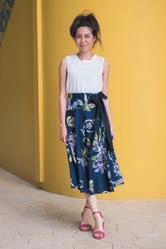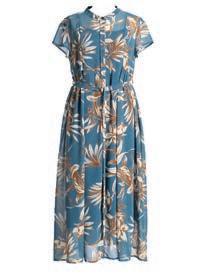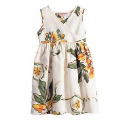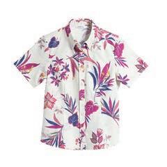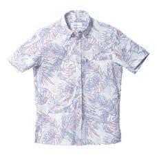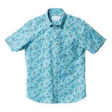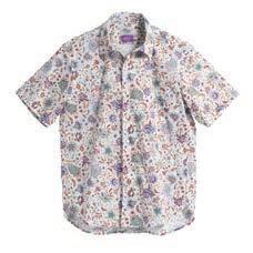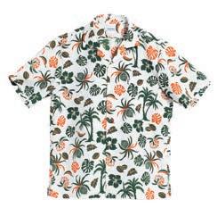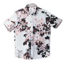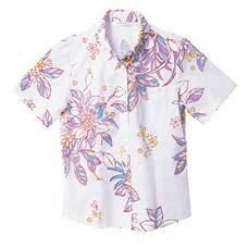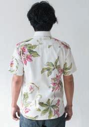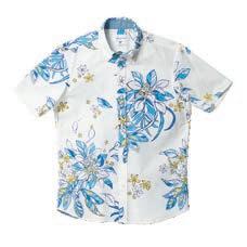 クロトン、マツリカ、コンロンカの南国らしい植物モチーフを組み合わせ、カラフルで元気な 印象のデザインに。柄が引き立つような爽やかな色使いが、着る人を選ばないオールマイティ な一枚です。