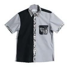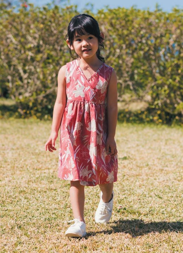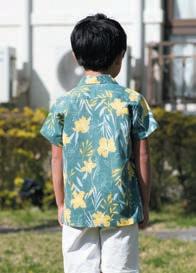 無地シャツの切り替え部分に、グロリオサの花をモチーフにした鮮やかな紅型プリントをプ ラス。フォーマルなシーンでさり気なく沖縄を感じられる、落ち着いた雰囲気のキッズシャツ です。家族でお揃いコーデが楽しめます。