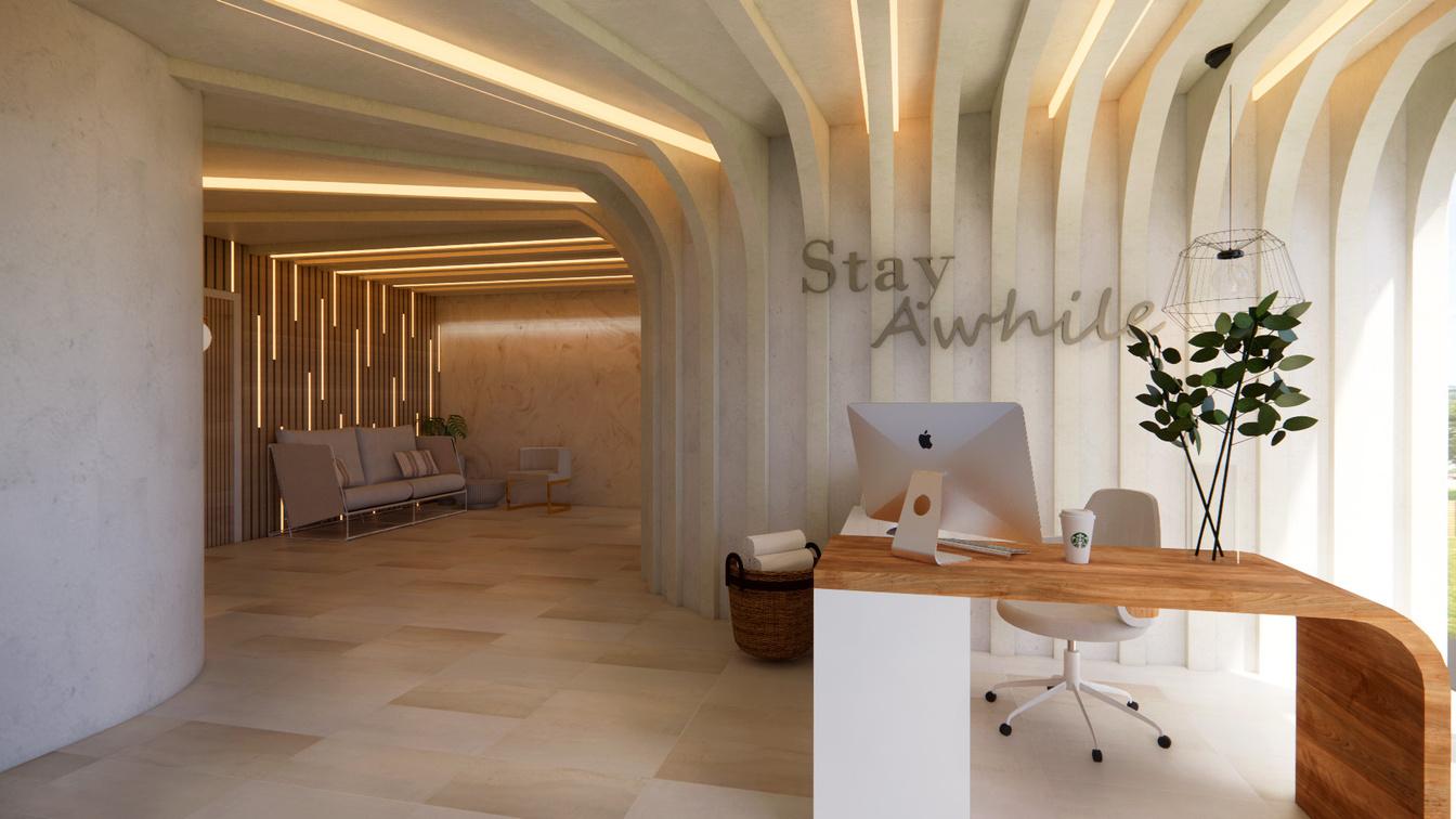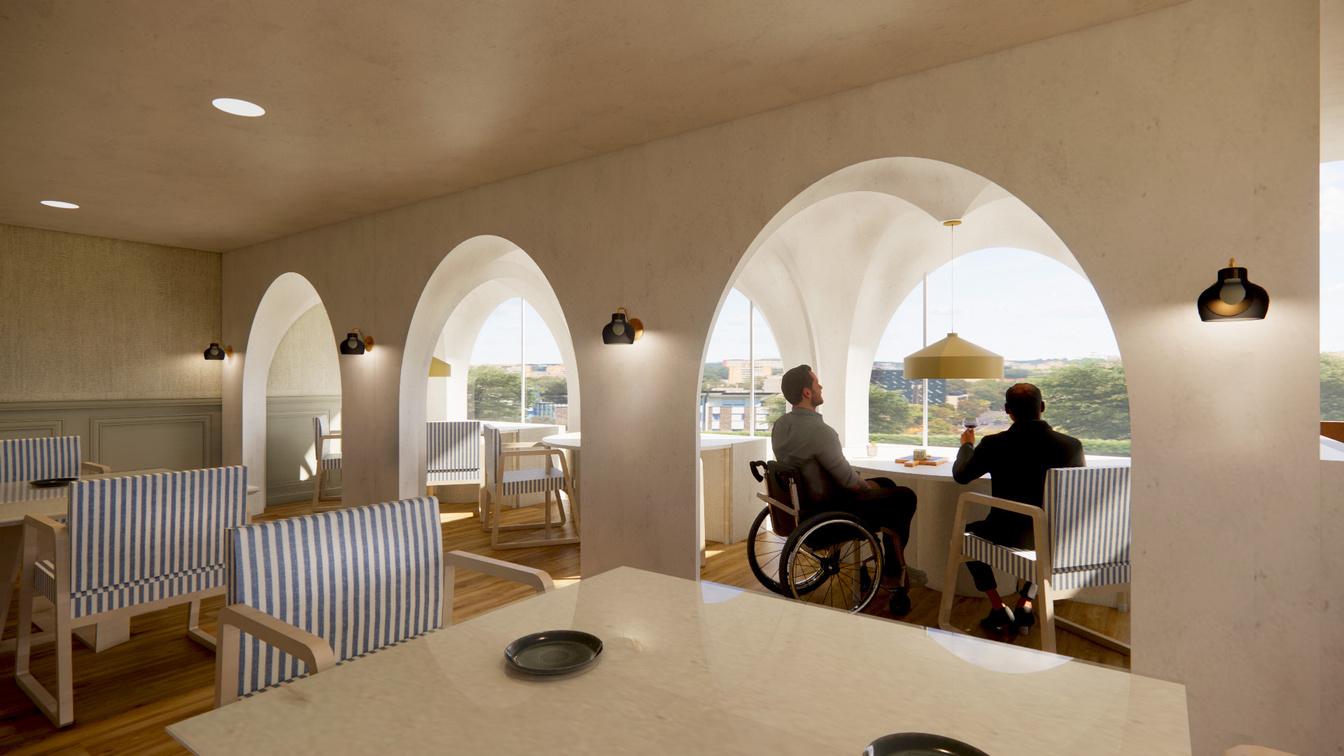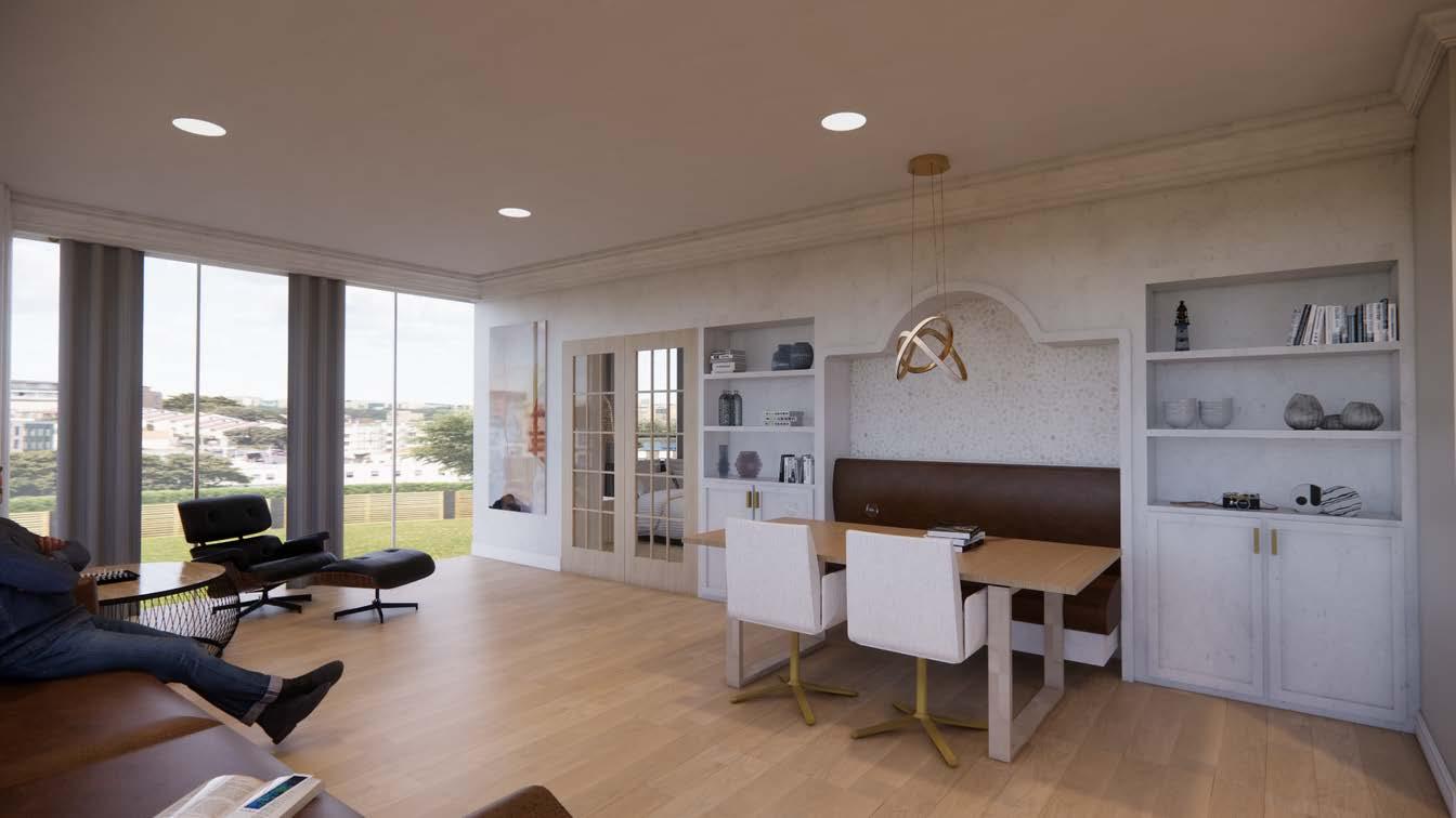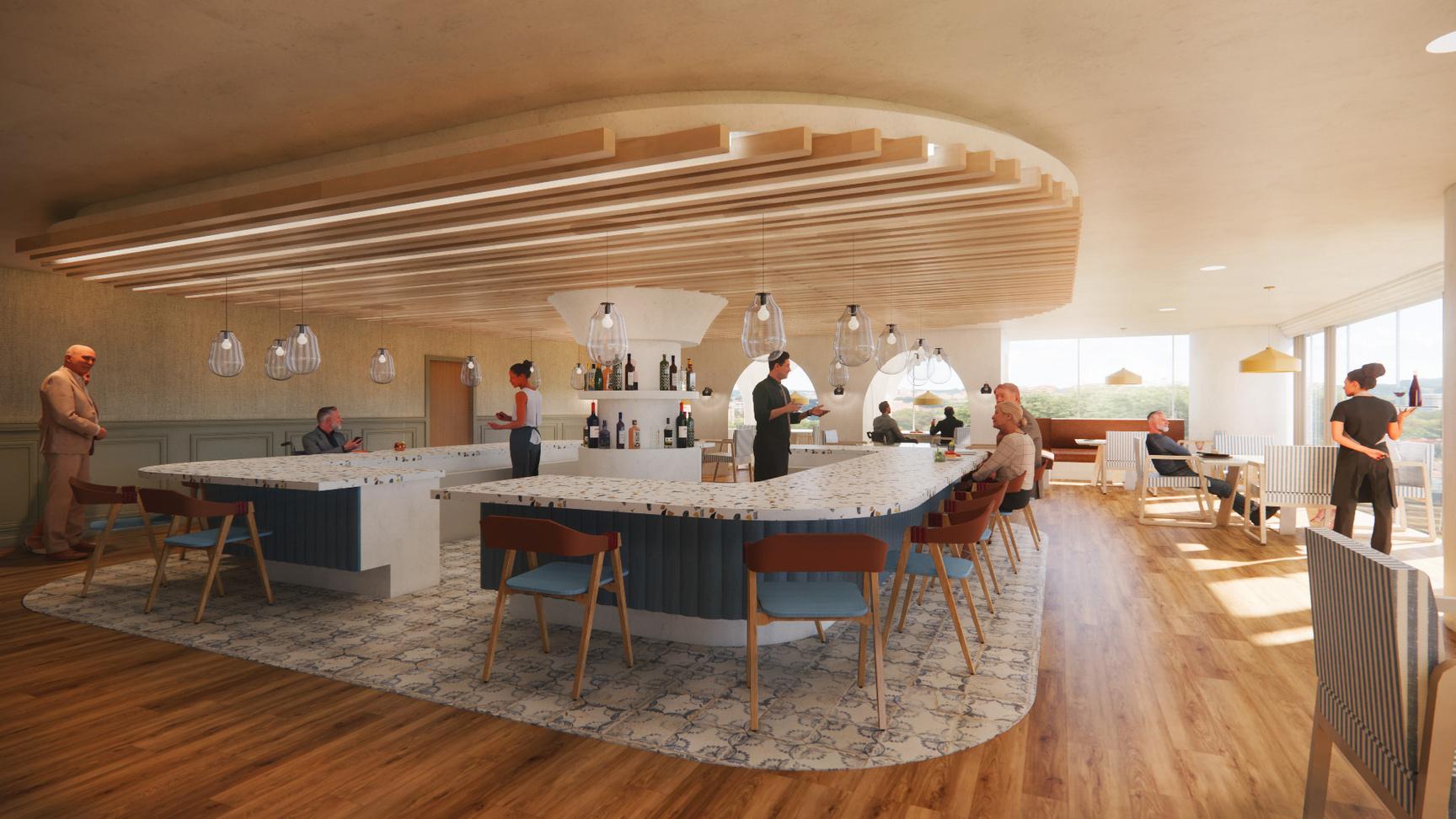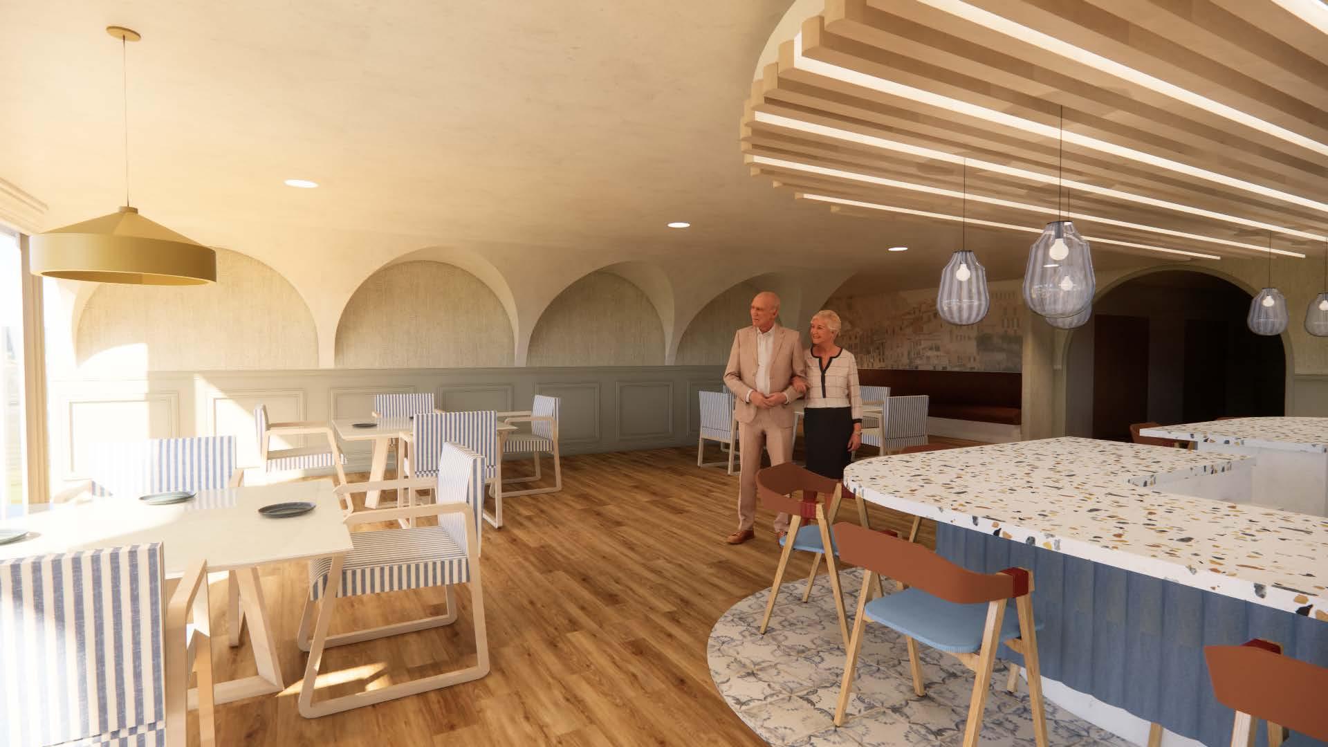 The AMA plaza in Chicago was transformed into an assisted living. By blending the comforts of home with a global travel charm, 'Timeless Wanderlust' creates a unique, enriching experience catered to our residents' care needs while embracing their adventurous spirit. Each floor offers a different traveling adventure. This floor is a coastal oasis. You will be taken on a trip to the coast that includes a seafood restaurant, a wellness room with a sauna and salt room, and customizable resident units.