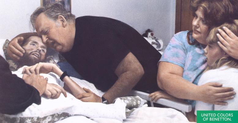 Pictured above is one of Oliviero’s pieces for Benneton which features gay activist and AIDs victim, David Kirby. Although the aim of this shoot was to bring awareness and stand in solidarity with AIDs victims, a topic at the time which was looked down on due to a lack of education and homophobic attitudes, groups of the public including gay rights activists called for a boycott of Benneton, with many claiming it spread fear and showed suffering as a commodity (Duffy, 2017). Although controversial, it was an extremely powerful move from Toscani, as throughout the 90s, AIDs was the leading cause of death for men between 25 and 44 (Duffy, 2017) but was still seen as dirty, so by publicising one victims story, they’re showing the LGBTQ+ community that they are seen and respected.