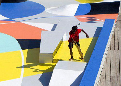 Undulating forms and curves of custom casework mirror organic and energetic flow of a skatepark