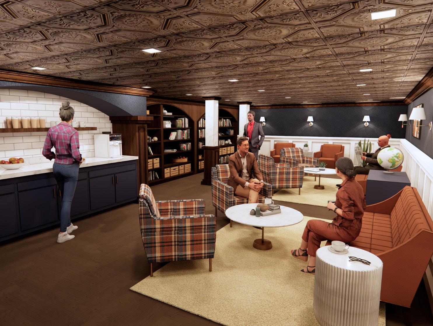 Self-serve coffee bar and lounge located in basement invites customers to relax and unwind
