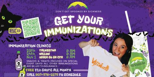 ing their health this winter. Keep your community safe: Getting vaccinated is more than just a personal choice—it’s a way to protect loved ones and neighbors. Every shot helps prevent the spread of illnesses that can hit hard during the colder months. Staying up to date on immunizations helps reduce stress on healthcare systems, keeps schools and workplaces healthier, and keeps the community thriving. Don’t wait—schedule today: Protect your health, enjoy a treat, and take home some spooky swag this October. Call 907376-2273 to schedule your appointment today. For more information, visit sunshineclinic.org.