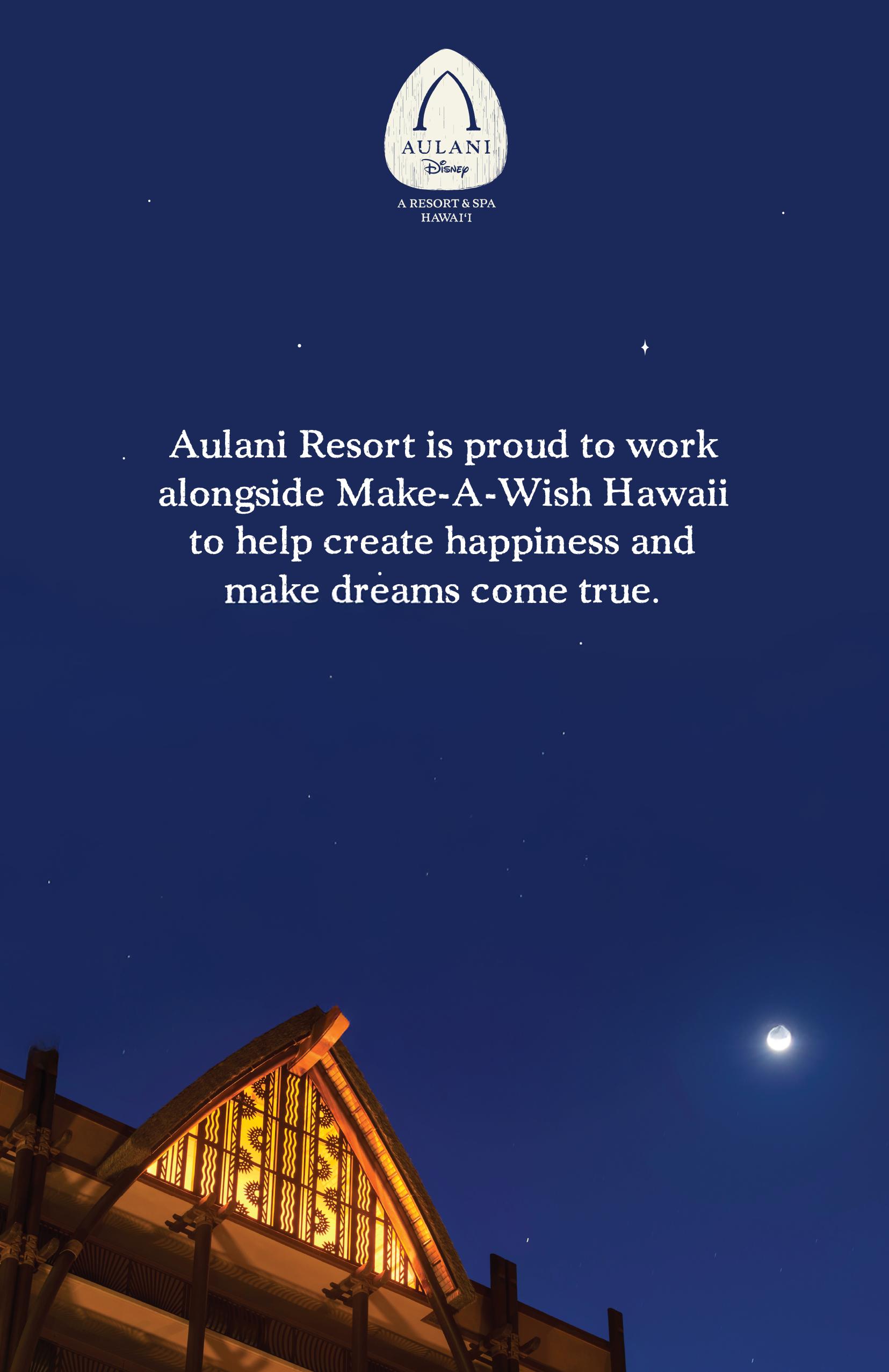 As a Disney® resort, bringing magic to life for children and their families is what Aulani does best. And as a longtime Make-A-Wish Hawaii partner that graciously hosts hundreds of local and visiting wish families every year, it’s no surprise that Aulani has earned our Magic Maker of the Year award! From staycations and wishes to dance with Mickey Mouse on the beach to “Wish Weeks” that bring numerous wish families together, Aulani has been the site of more than 1,575 transformational wishes over the past 10 years. Aulani also consistently supports our mission through generous donations and special touches at events like Jingle Rock Run (think Mickey Mouseshaped treats and beloved characters in festive outfits ready to cheer on our wish kids!). We could not be more grateful to the Aulani cast for helping to give keiki with critical illnesses the opportunity to recapture the magic of their childhoods and create memories that will last a lifetime.