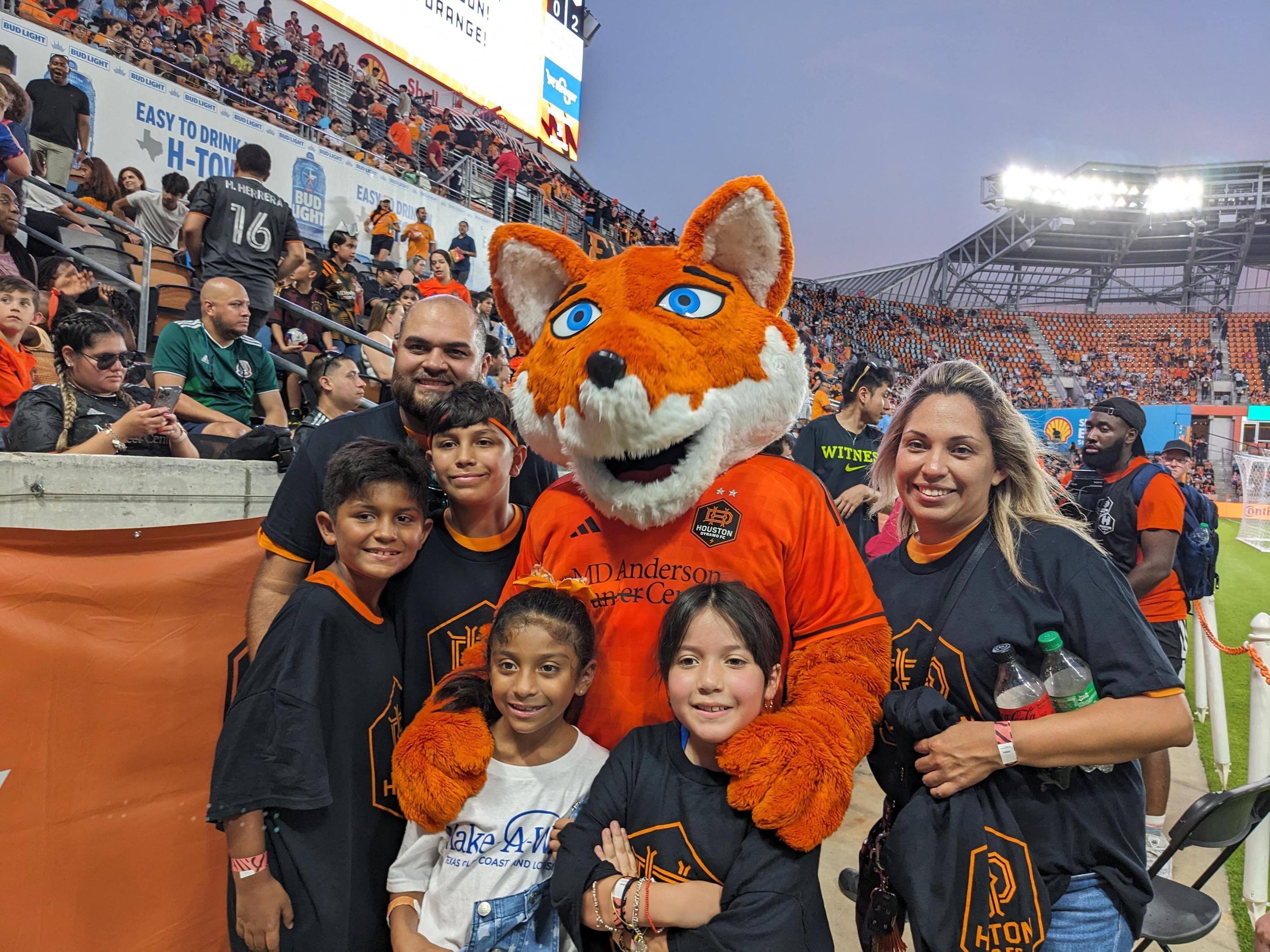 We hosted our first-ever alumni summer social at the Houston Dynamo game on July 12! Prior to kickoff, several alums and their families were on the field holding the giant MLS flag. At halftime, the group went back on the field for photos with Dynamo mascot, Diesel!