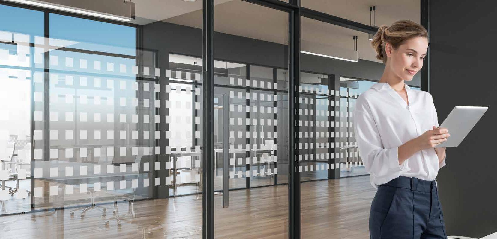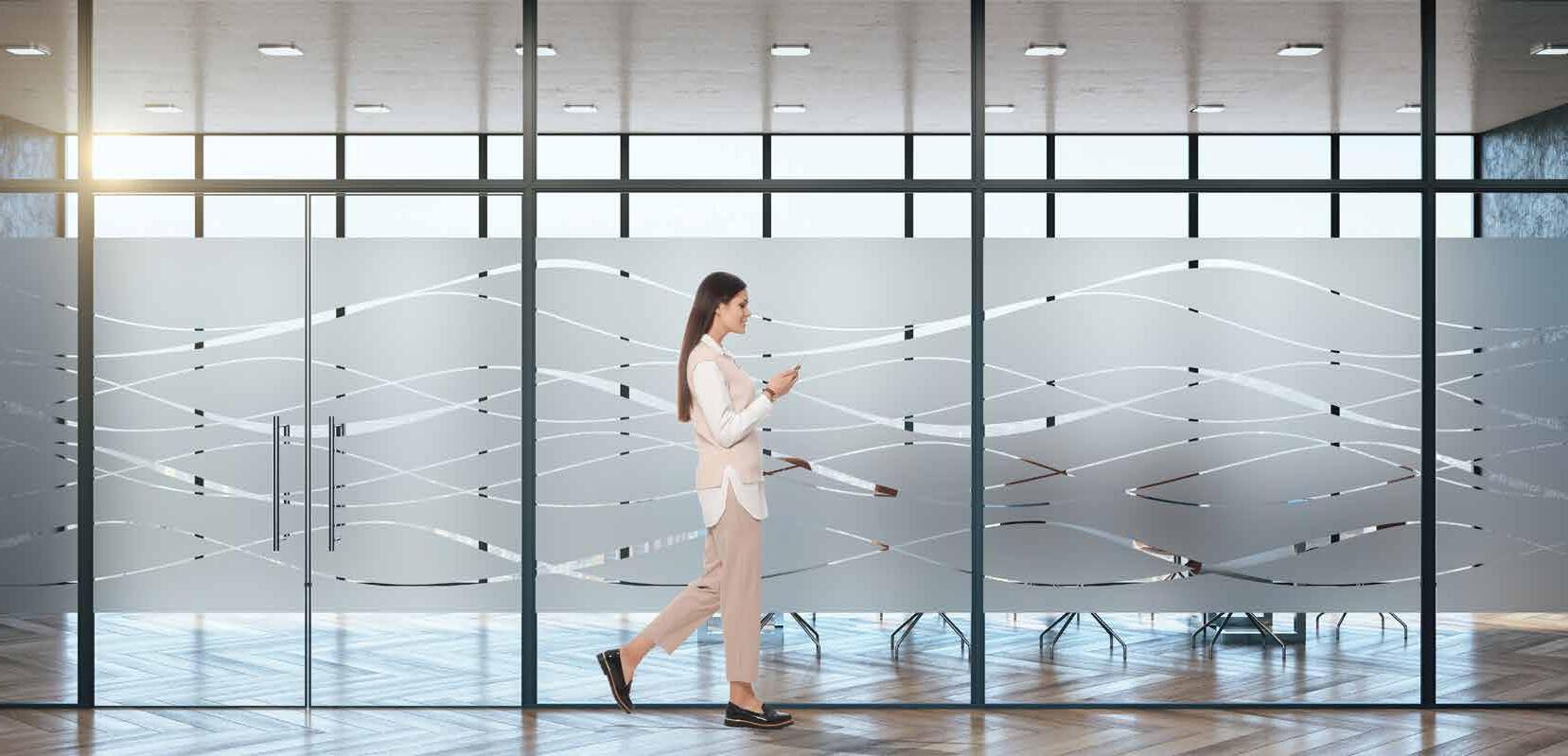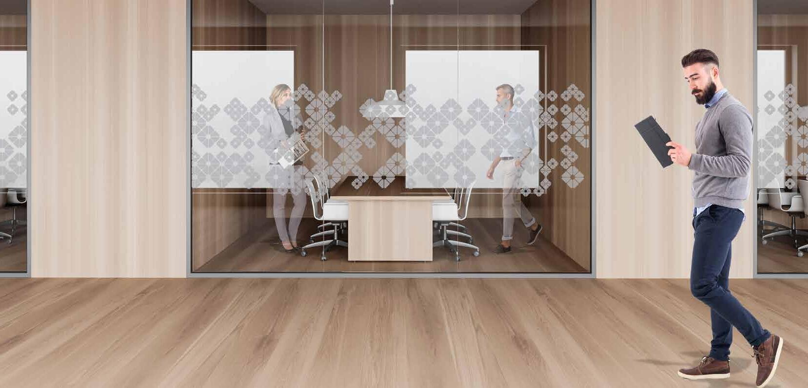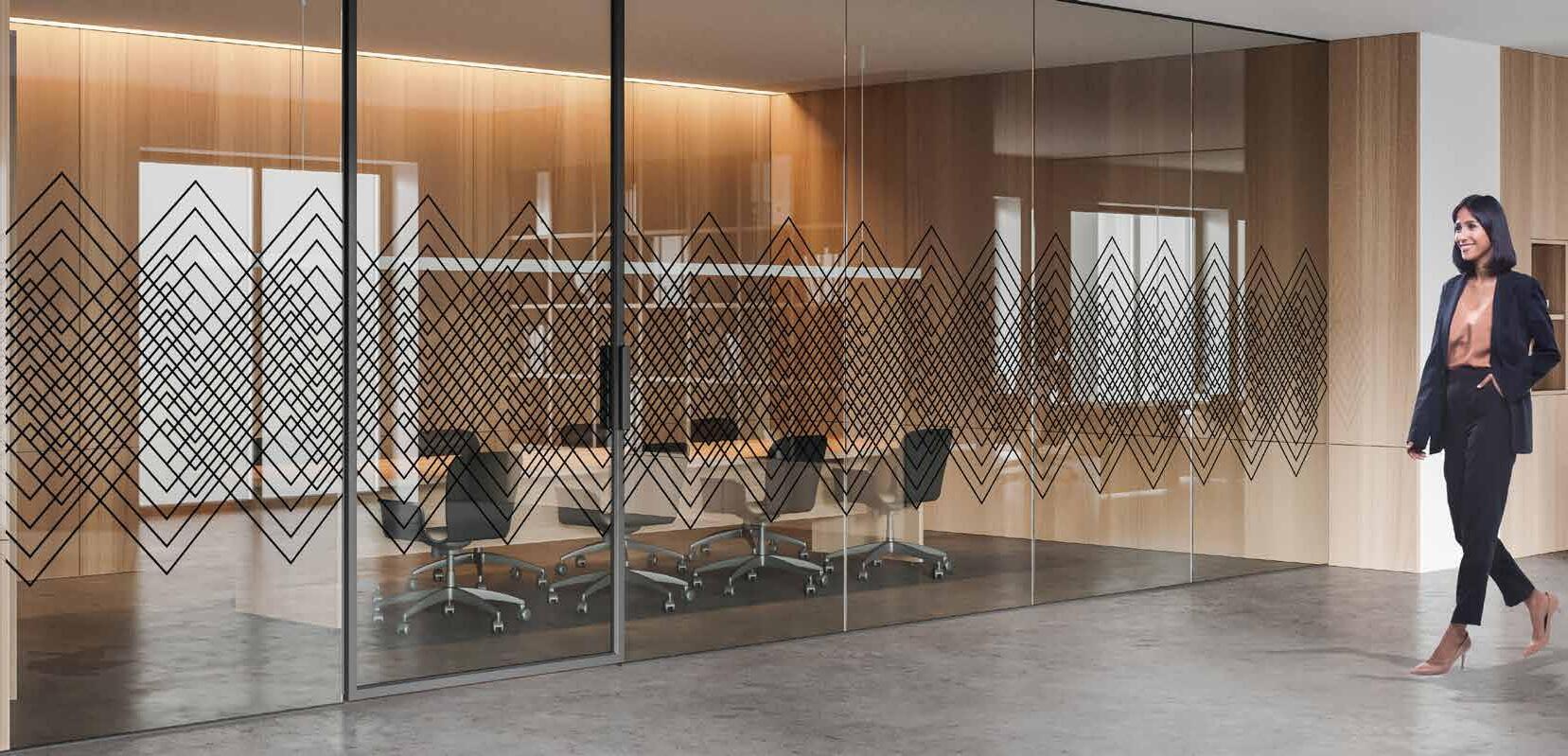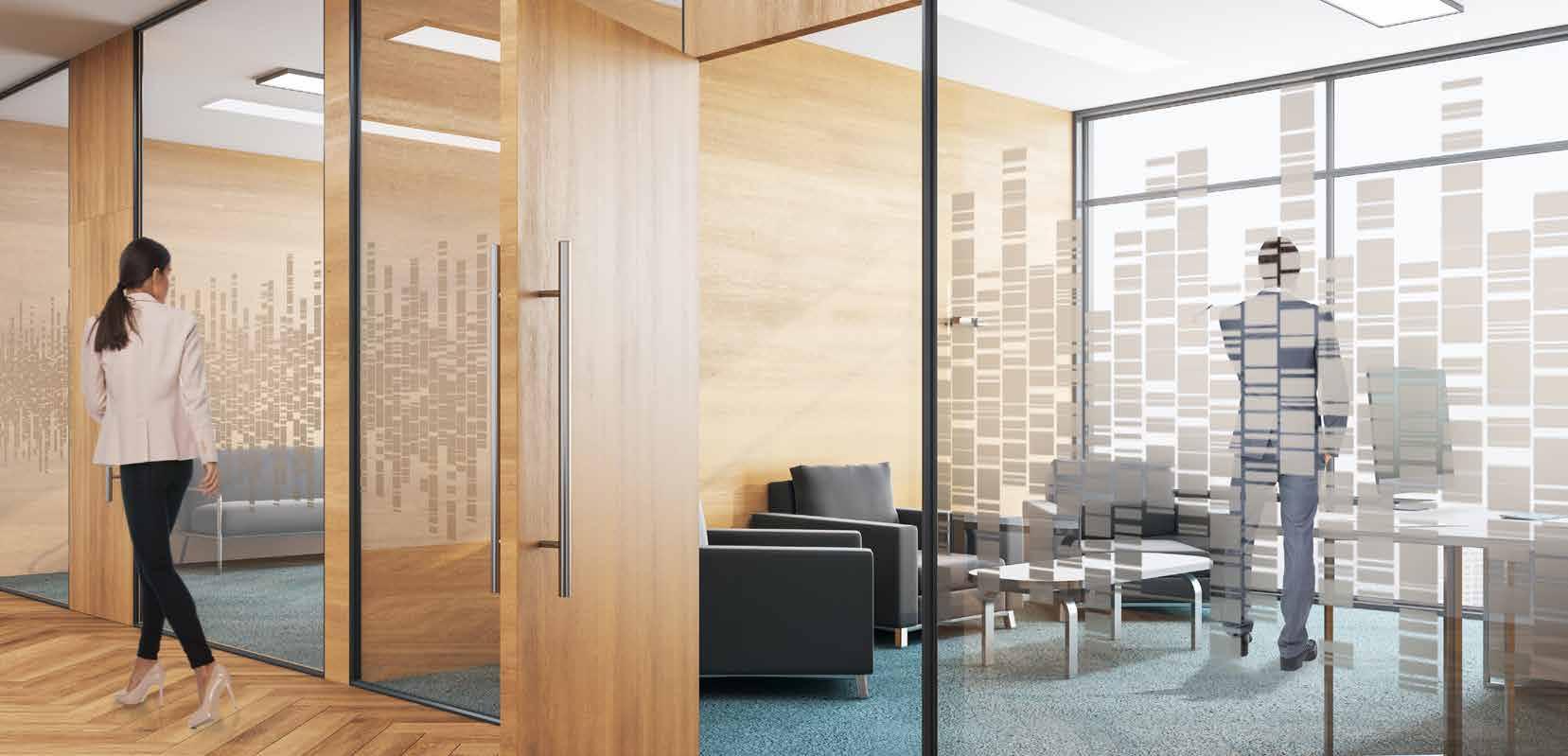 I dag er kontorlandskap, skoler og helsebygg i endring. Der det før var små cellekontor er det i dag landskap, stillerom, arbeidssoner, sosiale soner og teamsrom. Det krever en helt annen type veifinning og skjerming enn før. De moderne glassveggene, skilleveggene og landskapene gir nye muligheter til å lage estetisk gode veggflater og samtidig formidle identitet, tilhørighet og gi verdifull informasjon.