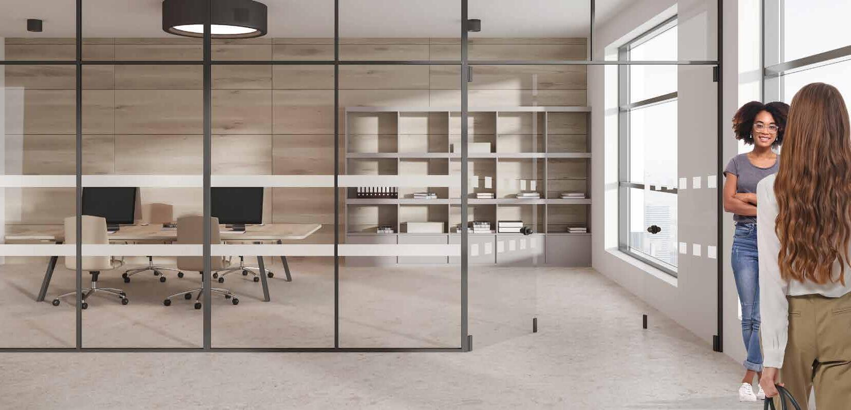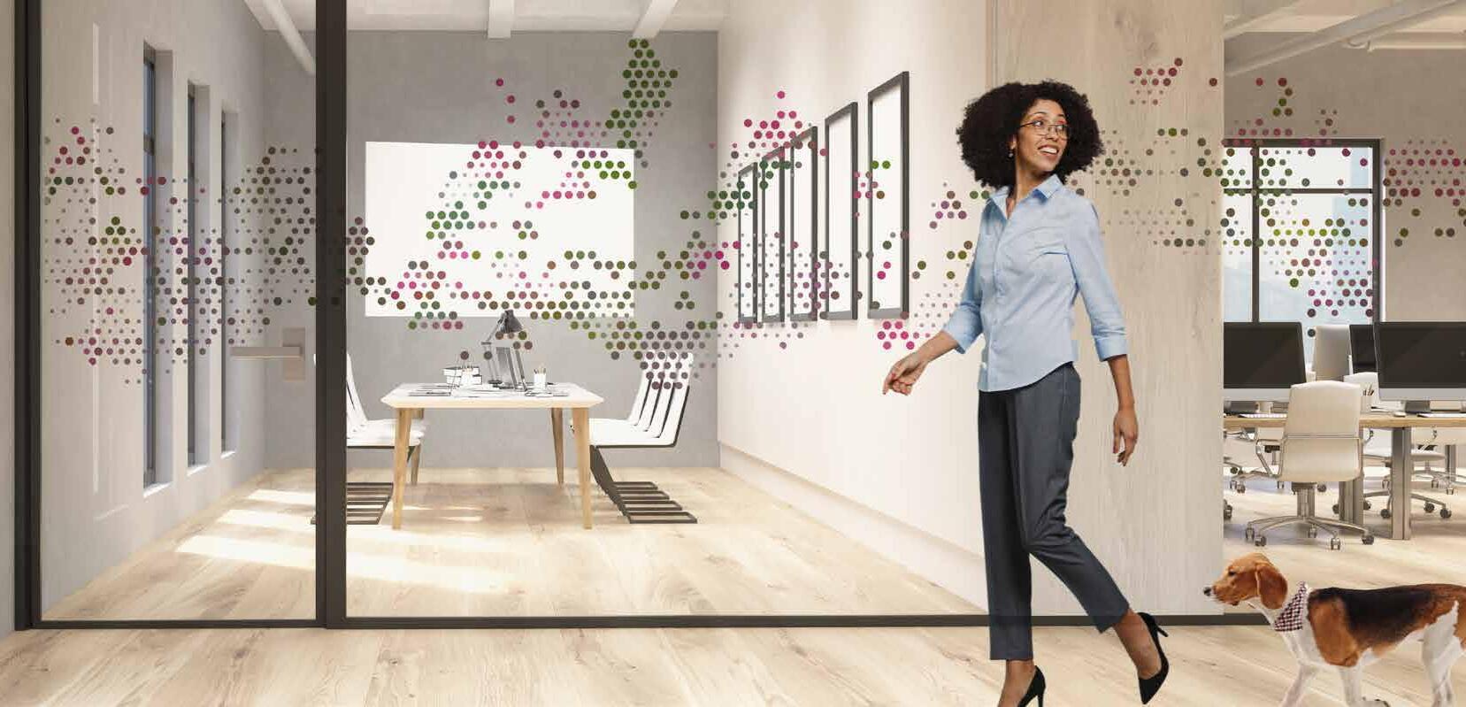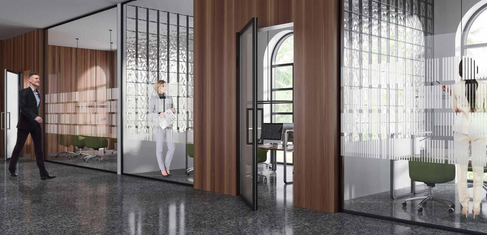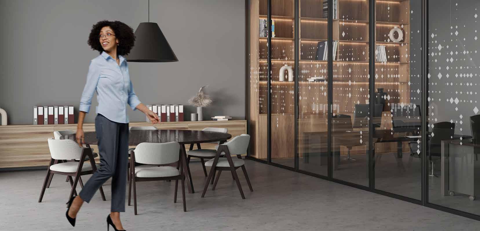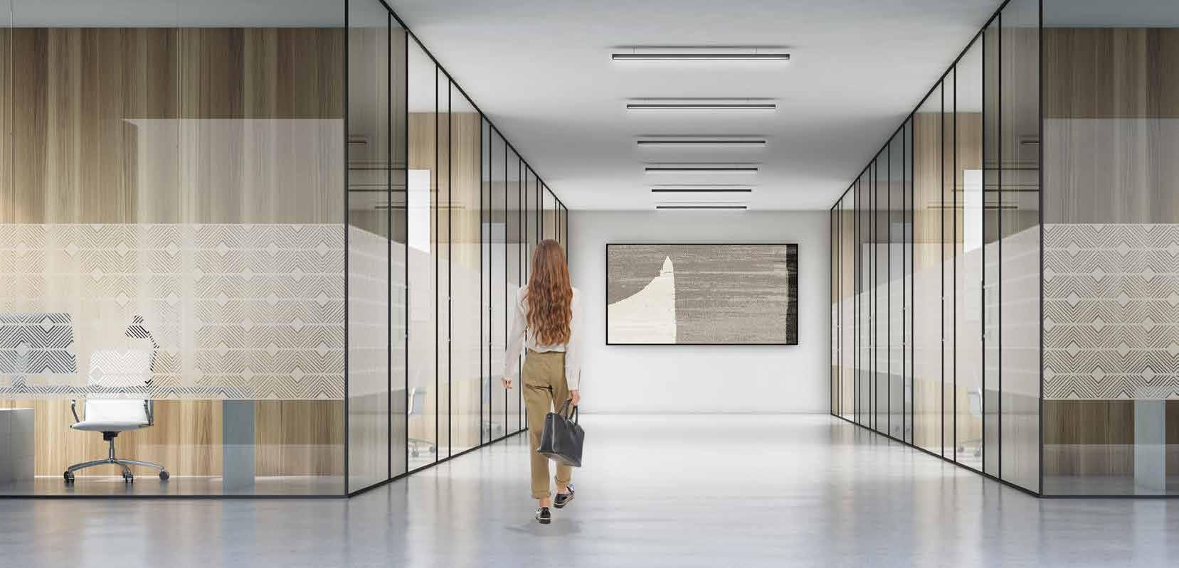 I dag er kontorlandskap, skoler og helsebygg i endring. Der det før var små cellekontor er det i dag landskap, stillerom, arbeidssoner, sosiale soner og teamsrom. Det krever en helt annen type veifinning og skjerming enn før. De moderne glassveggene, skilleveggene og landskapene gir nye muligheter til å lage estetisk gode veggflater og samtidig formidle identitet, tilhørighet og gi verdifull informasjon.