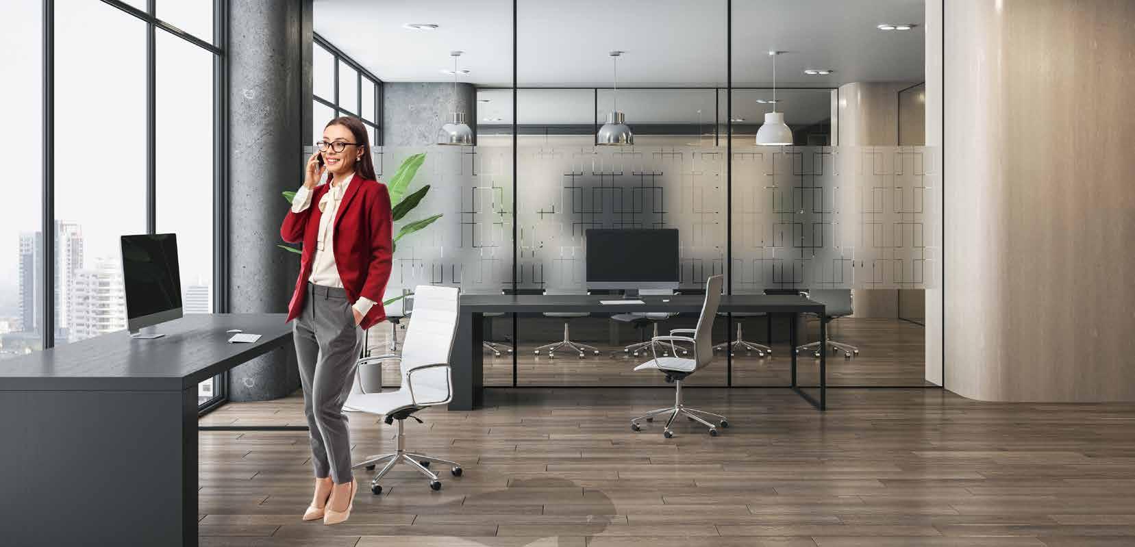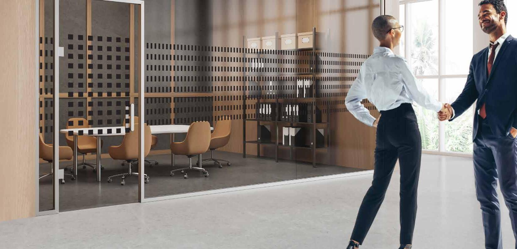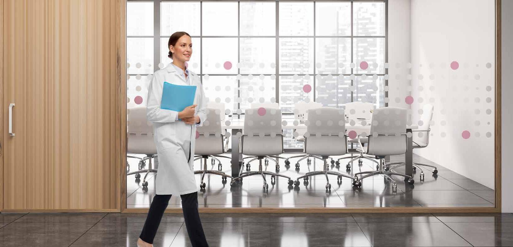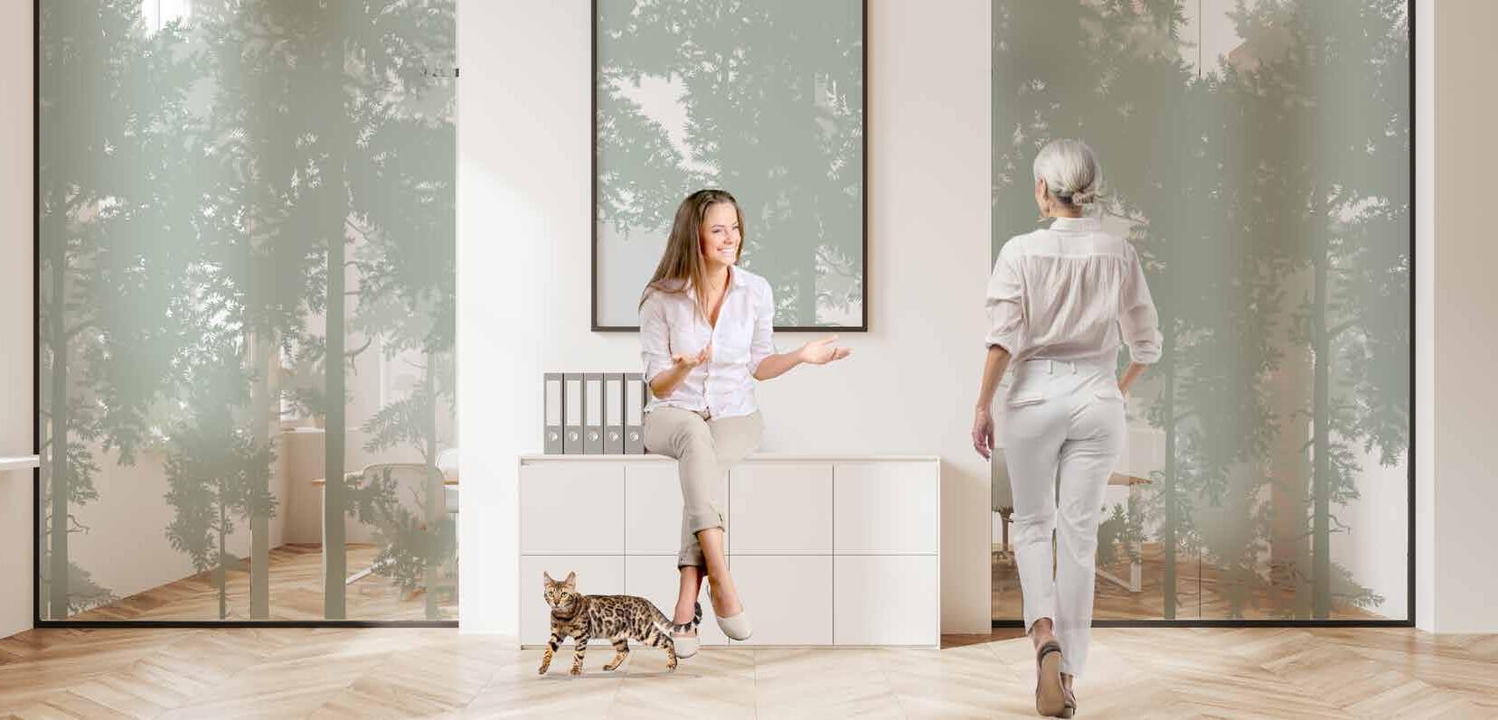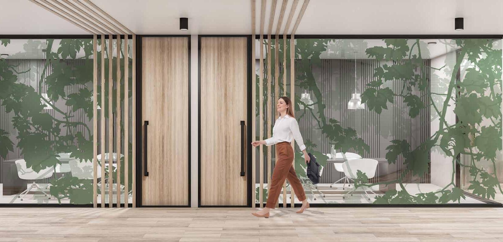 I dag er kontorlandskap, skoler og helsebygg i endring. Der det før var små cellekontor er det i dag landskap, stillerom, arbeidssoner, sosiale soner og teamsrom. Det krever en helt annen type veifinning og skjerming enn før. De moderne glassveggene, skilleveggene og landskapene gir nye muligheter til å lage estetisk gode veggflater og samtidig formidle identitet, tilhørighet og gi verdifull informasjon.