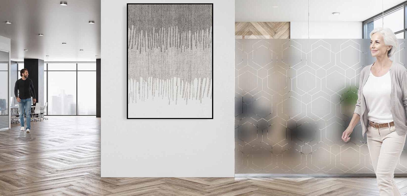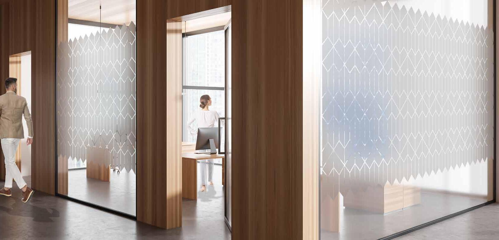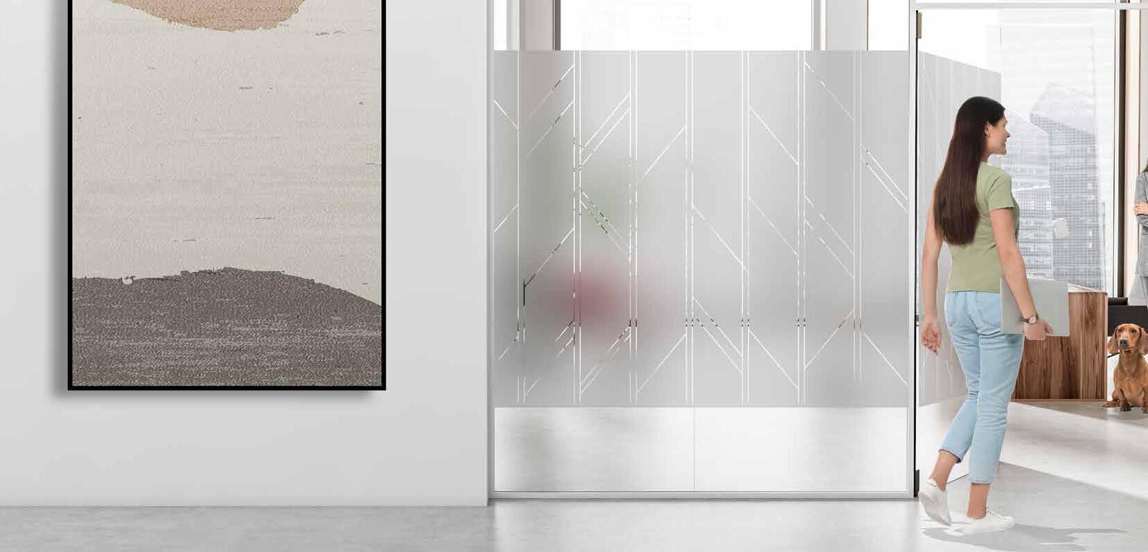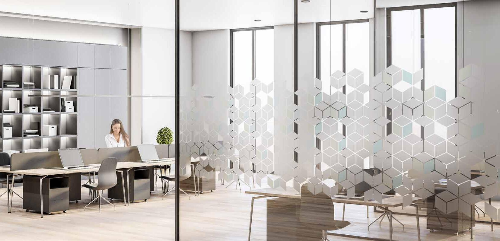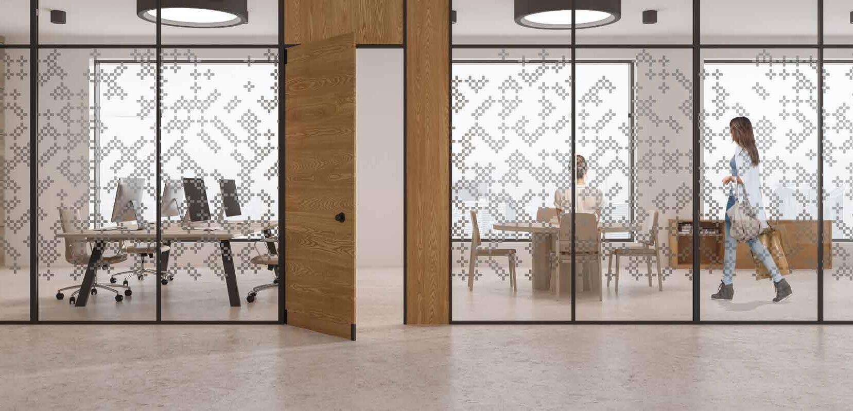 Spennende design som krever din oppmerksomhet. Mønsteret på tett folie passer ypperlig i kreative miljøer. Bruk frostfolie hvis du vil ha et mer elegant uttrykk. Delvis innsynsskjerming og møter krav for universiell utforming.