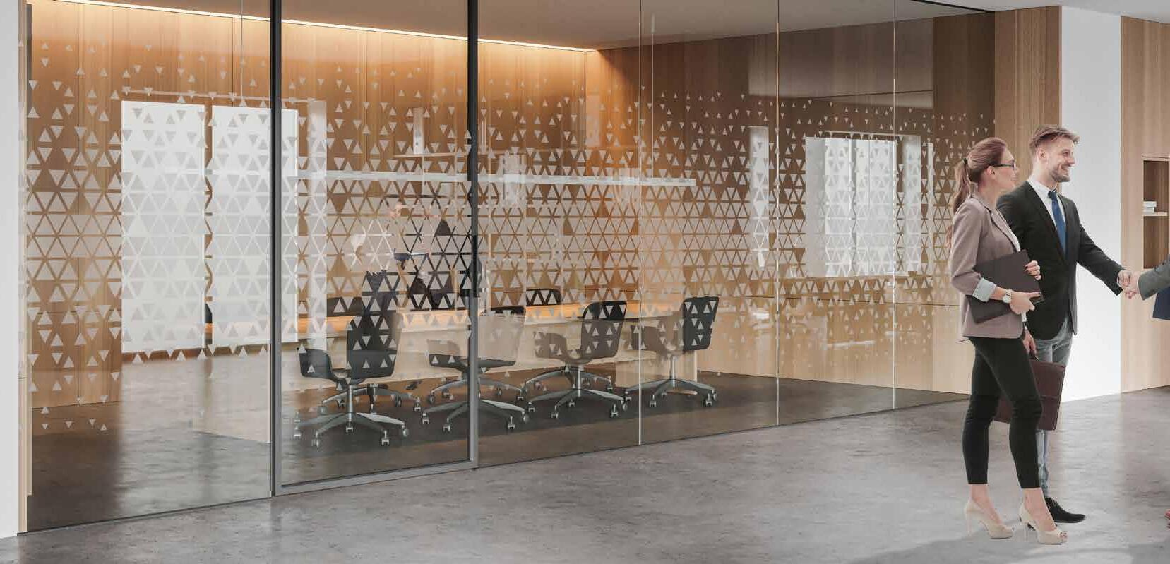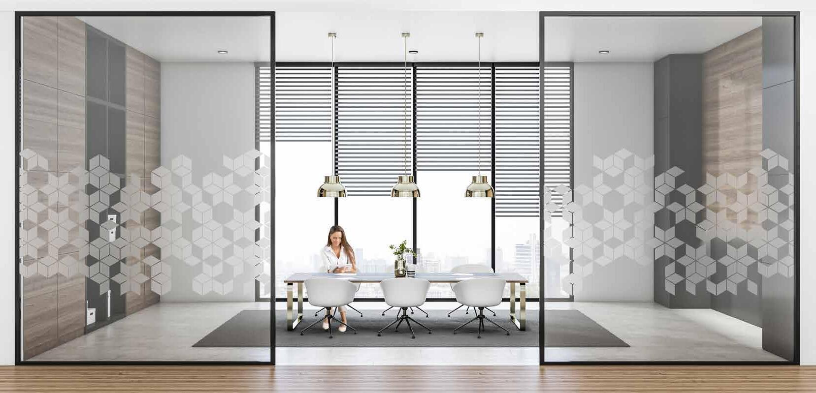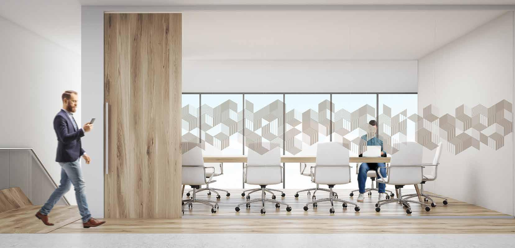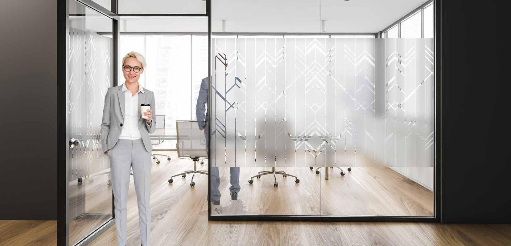 Spennende design som krever din oppmerksomhet. Mønsteret på tett folie passer ypperlig i kreative miljøer. Bruk frostfolie hvis du vil ha et mer elegant uttrykk. Delvis innsynsskjerming og møter krav for universiell utforming.