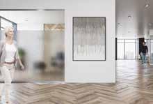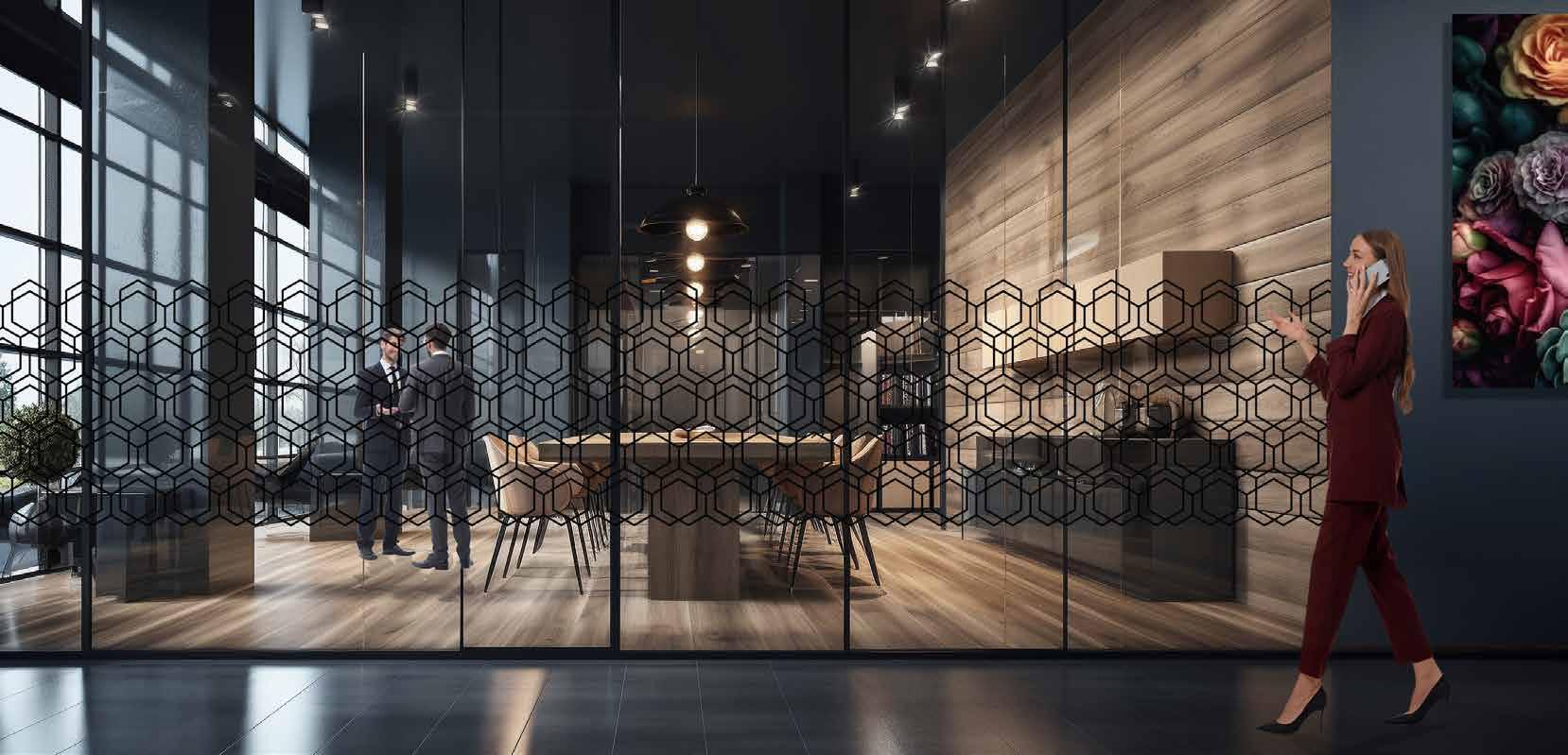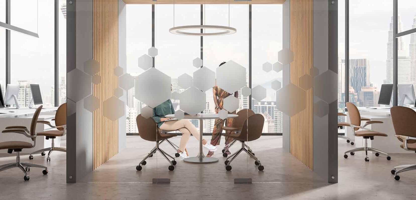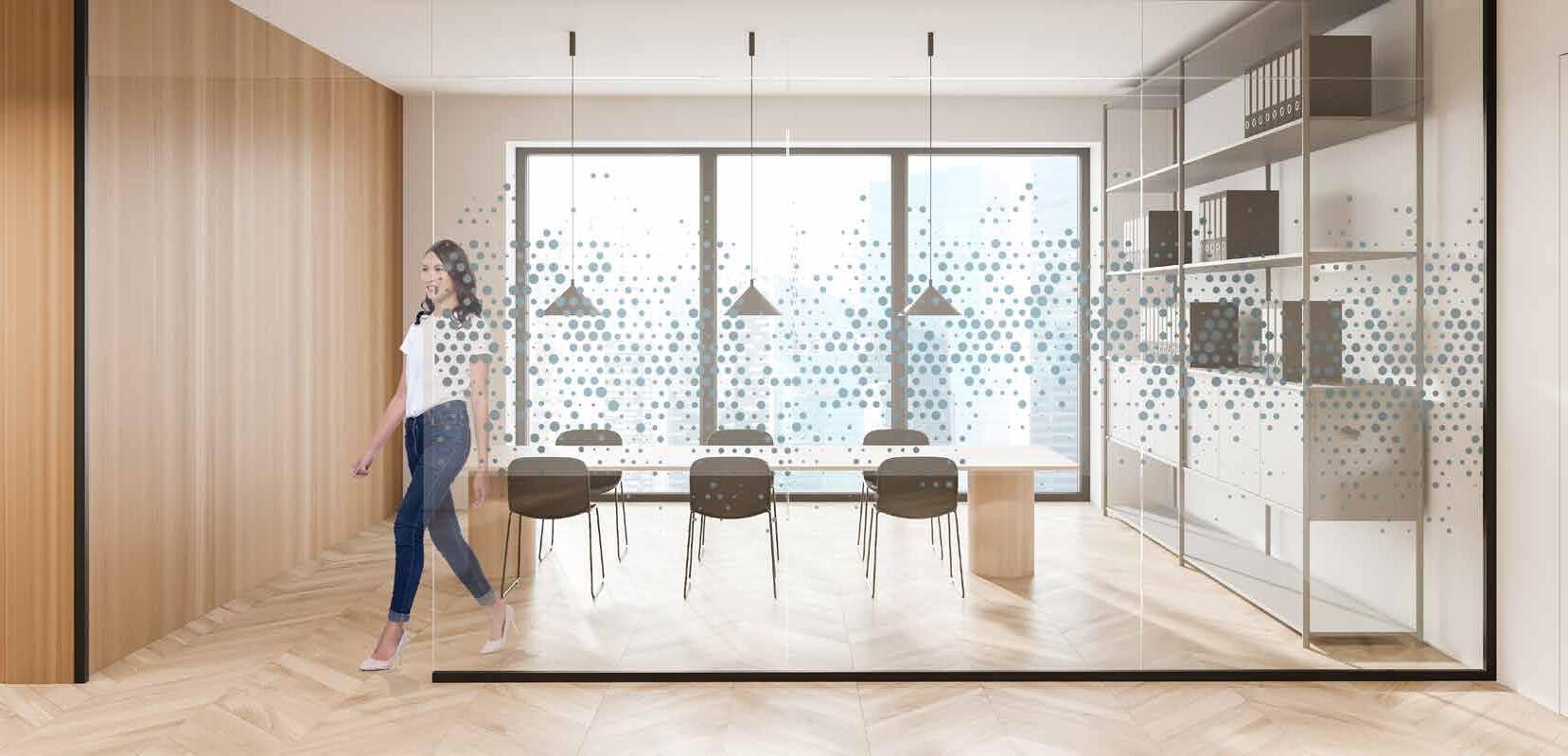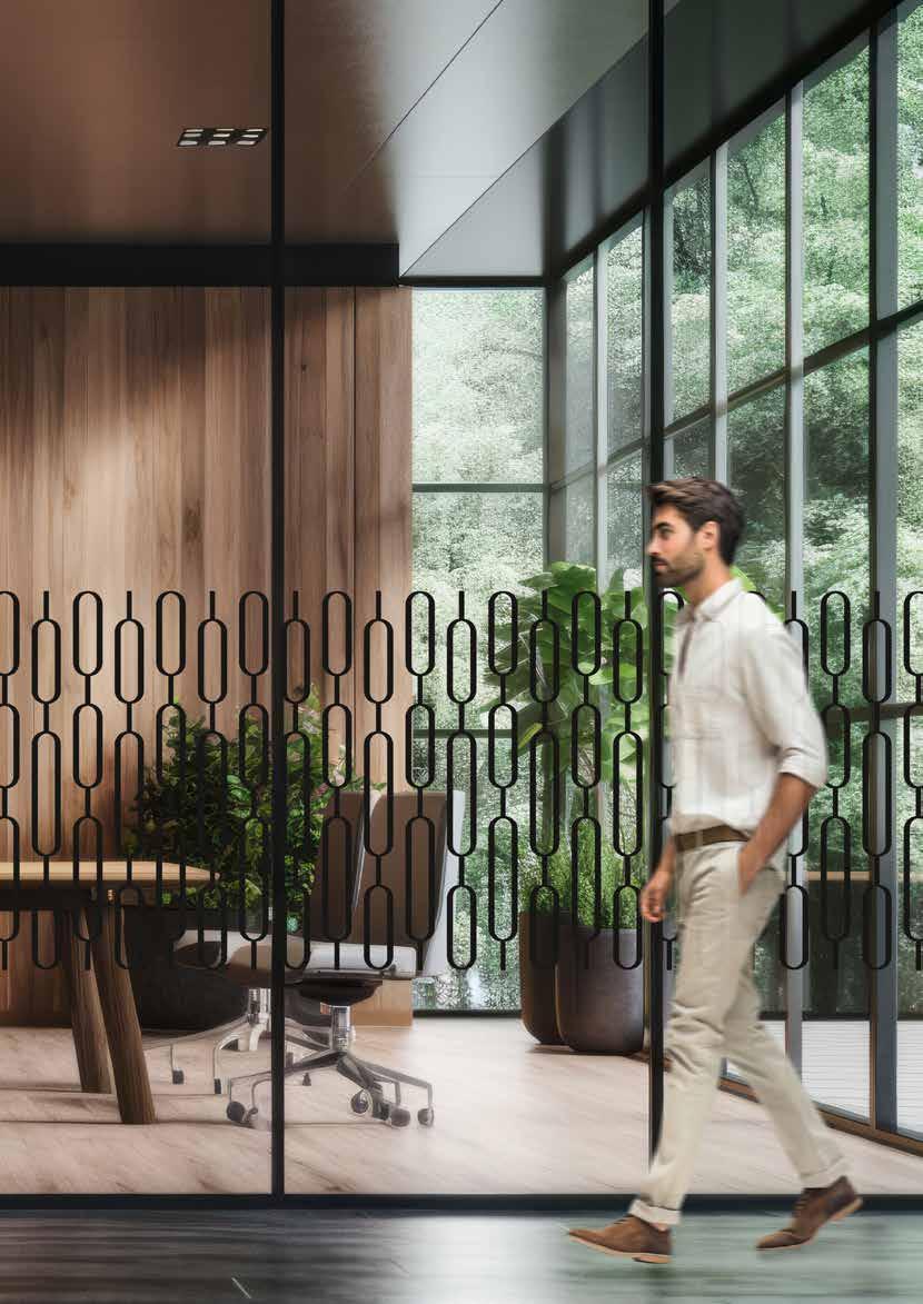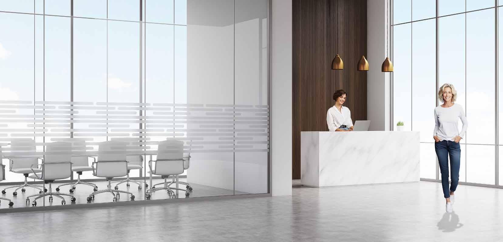 Spennende design som krever din oppmerksomhet. Mønsteret på tett folie passer ypperlig i kreative miljøer. Bruk frostfolie hvis du vil ha et mer elegant uttrykk. Delvis innsynsskjerming og møter krav for universiell utforming.