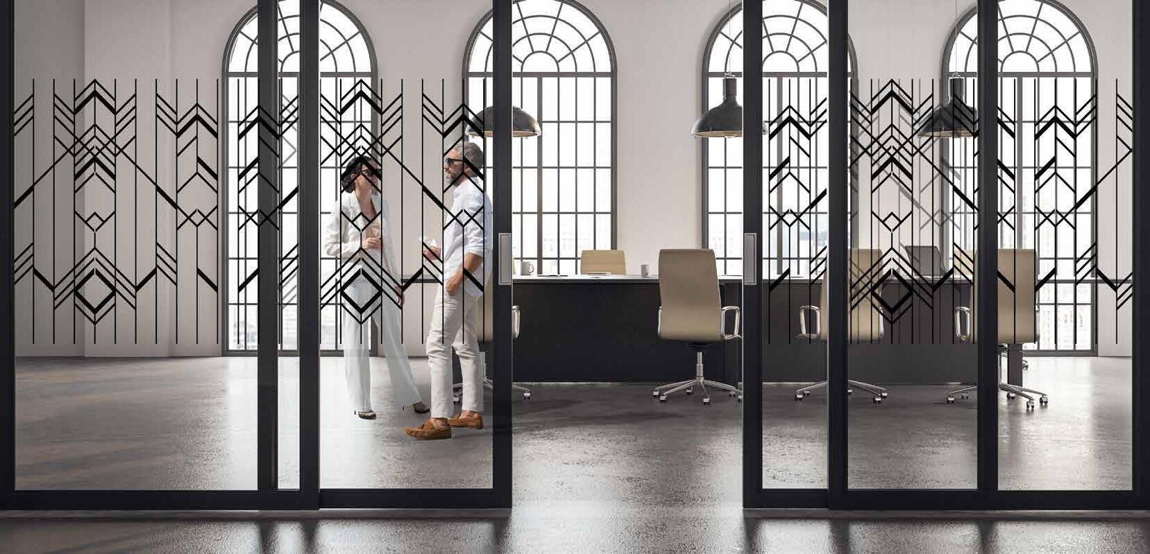 Hva får man når man kombinerer geometriske former med art-deco? Man får geo-deco! Designet er dekkende men samtidig luftig og lett. For mer innsynsskjerming kan man printe mønsteret på frost. Ønsker man en lettere variant går man for print på glassklar folie med transparente felter som på bildet.