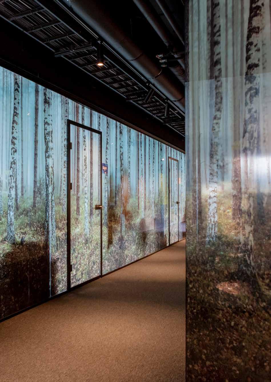 Bring naturen inn! Fint mønster fra gulv til tak med skogprofil. De forskjellige dybdene skaper ro og harmoni. Passer best på glassklar folie med farget trykk.