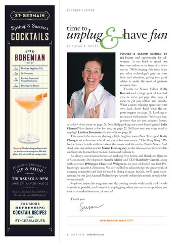 beauty and opportunity for adventure—is too brief to spend our free time online or in front of a video screen. We’re hoping this issue helps you relax technology’s grip on your time and attention, giving you great advice to make the most of glorious summer days. Thanks to Senior Editor Kelly Konrad and a large pool of talented experts, we’ve got page after page of ideas to get you offline and outside. Want a more relaxing space out your own back door? Read what the experts suggest on page 23. Looking to reconnect with nature? We’ve got suggestions that are just minutes, hours, or a day’s drive away on page 20. Need help picking out a new board game? Julie Chernoff has chosen a few for you, on page 22. Still not sure you even need to unplug? Lindsay Roseman tells you why on page 24. This month the stars are shining a little brighter, too—New Trier grad Katie Chang is set to become a breakout star in her new movie, “The Bling Ring.” We had a chance to talk with her about the movie and life on the North Shore. And don’t miss our sitdown with Mariel Hemingway, as she discusses her frenzied life and how she learned how to slow down and reclaim it. As always, our mission focuses on making lives better, and thanks to Director of Community Development Sandra Miller and CEO Kimberly Carroll, along with sponsors JPMorgan Chase and Walgreens, we just celebrated our first Philanthropy Awards Celebration. We are thrilled to acknowledge the great work of so many nonprofits and look forward to doing it again. In fact, we’ll open nominations for our 2nd Annual Philanthropy Awards online this month at makeitbetter.net/awards. So please, enjoy this magazine and the coming month with family and friends as much as possible, and commit to unplugging when you can—except when you visit us at makeitbetter.net, of course! its