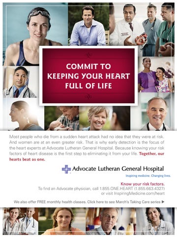 Know your risk factors. To find an Advocate physician, call 1.855.ONE.HEART (1.855.663.4327) or visit InspiringMedicine.com/heart We also offer FREE monthly health classes. Click here to see March’s Taking Care series u