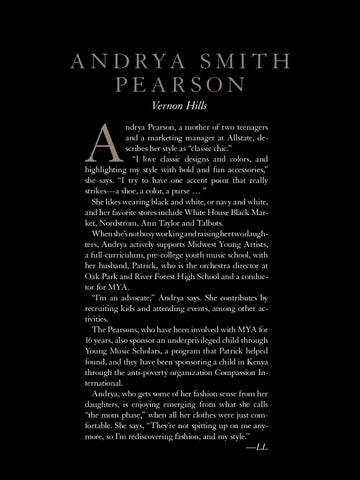 ndrya Pearson, a mother of two teenagers and a marketing manager at Allstate, describes her style as “classic chic.” “I love classic designs and colors, and highlighting my style with bold and fun accessories,” she says. “I try to have one accent point that really strikes—a shoe, a color, a purse … ” She likes wearing black and white, or navy and white, and her favorite stores include White House Black Market, Nordstrom, Ann Taylor and Talbots. When she’s not busy working and raising her two daughters, Andrya actively supports Midwest Young Artists, a full-curriculum, pre-college youth music school, with her husband, Patrick, who is the orchestra director at Oak Park and River Forest High School and a conductor for MYA. “I’m an advocate,” Andrya says. She contributes by recruiting kids and attending events, among other activities. The Pearsons, who have been involved with MYA for 16 years, also sponsor an underprivileged child through Young Music Scholars, a program that Patrick helped found, and they have been sponsoring a child in Kenya through the anti-poverty organization Compassion International. Andrya, who gets some of her fashion sense from her daughters, is enjoying emerging from what she calls “the mom phase,” when all her clothes were just comfortable. She says, “They’re not spitting up on me anymore, so I’m rediscovering fashion, and my style.”