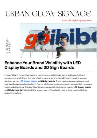 In today’s highlycompetitive business environment, establishing a strong and impactful brand presence is crucial One of the most effectiveways to achieve this is through innovative signage solutions such as LED displayboards and 3D sign boards.These modern signage options are not onlyvisuallyappealing but also highlyfunctional, allowing businesses to communicate theirmessages clearlyand attractively At Urban GlowSignage,we specialize in creating custom LED displayboards and 3D sign boards that caterto the unique needs of ourclients, helping them stand out in their respective markets