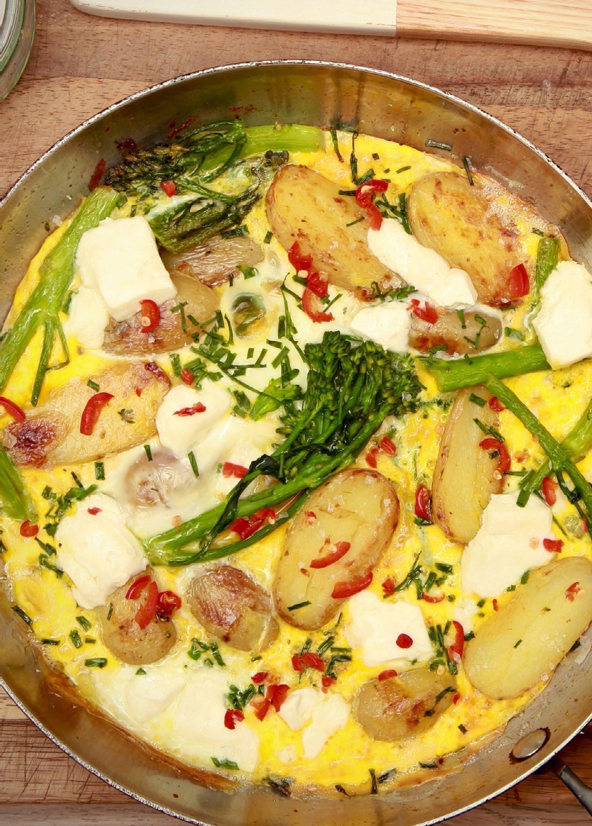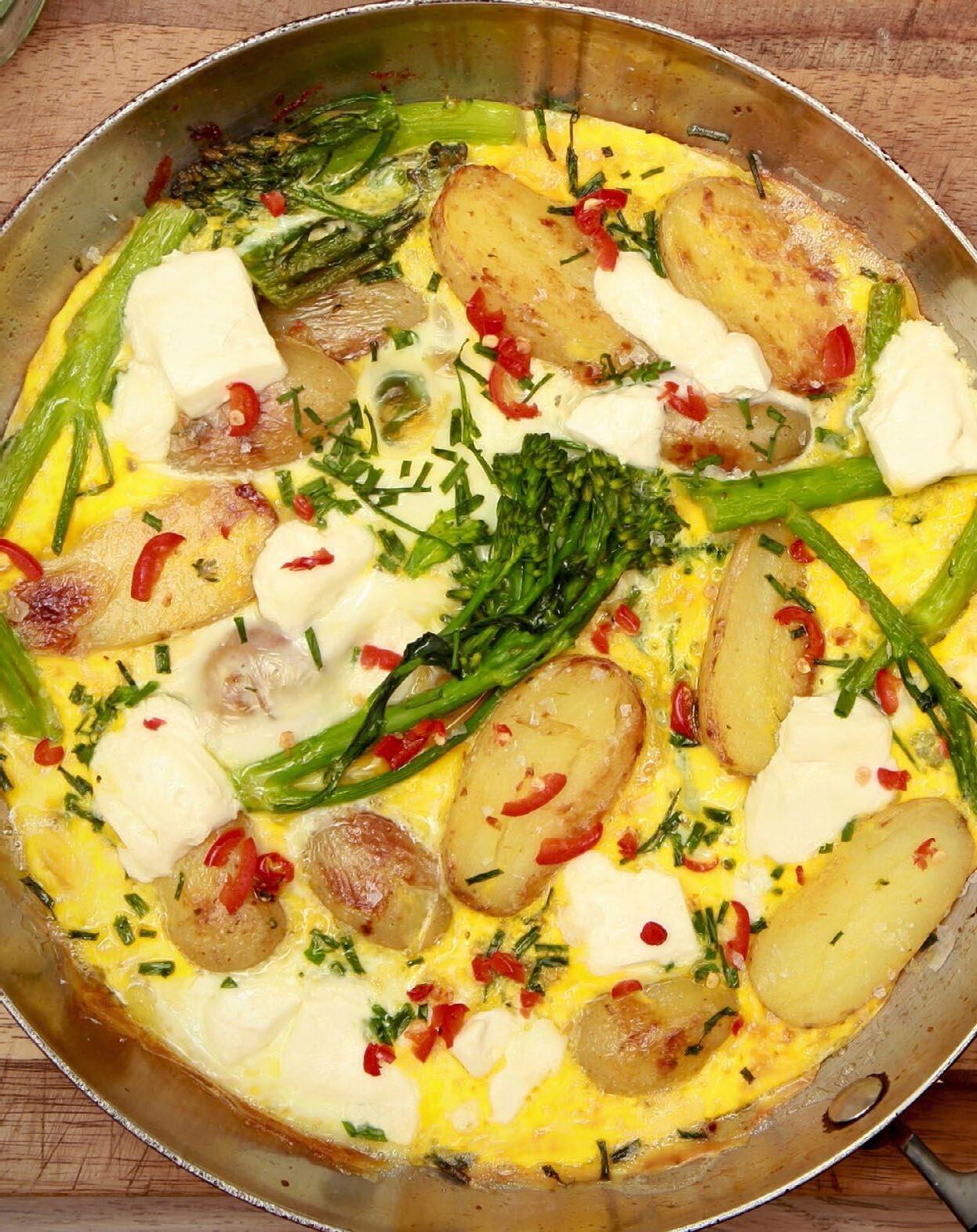 Add oil and butter to a frying pan. When it’s bubbly, add the halved potatoes. Lightly fry them for about 8 mins. You’re looking for a light gold colour. Add the broccoli and after a minute or so, the eggs. Shake the pan lightly so the egg covers the whole pan. Cook for 5 mins. Add the feta, chives and chilli and stick under the grill for a few more minutes, until the egg has just cooked through. Take it out and season with a good pinch of salt and pepper. It’s easy enough to divide with a metal spatula in the pan. Or, if you’re salivating, as I was, just eat the whole thing yourself straight from the pan.