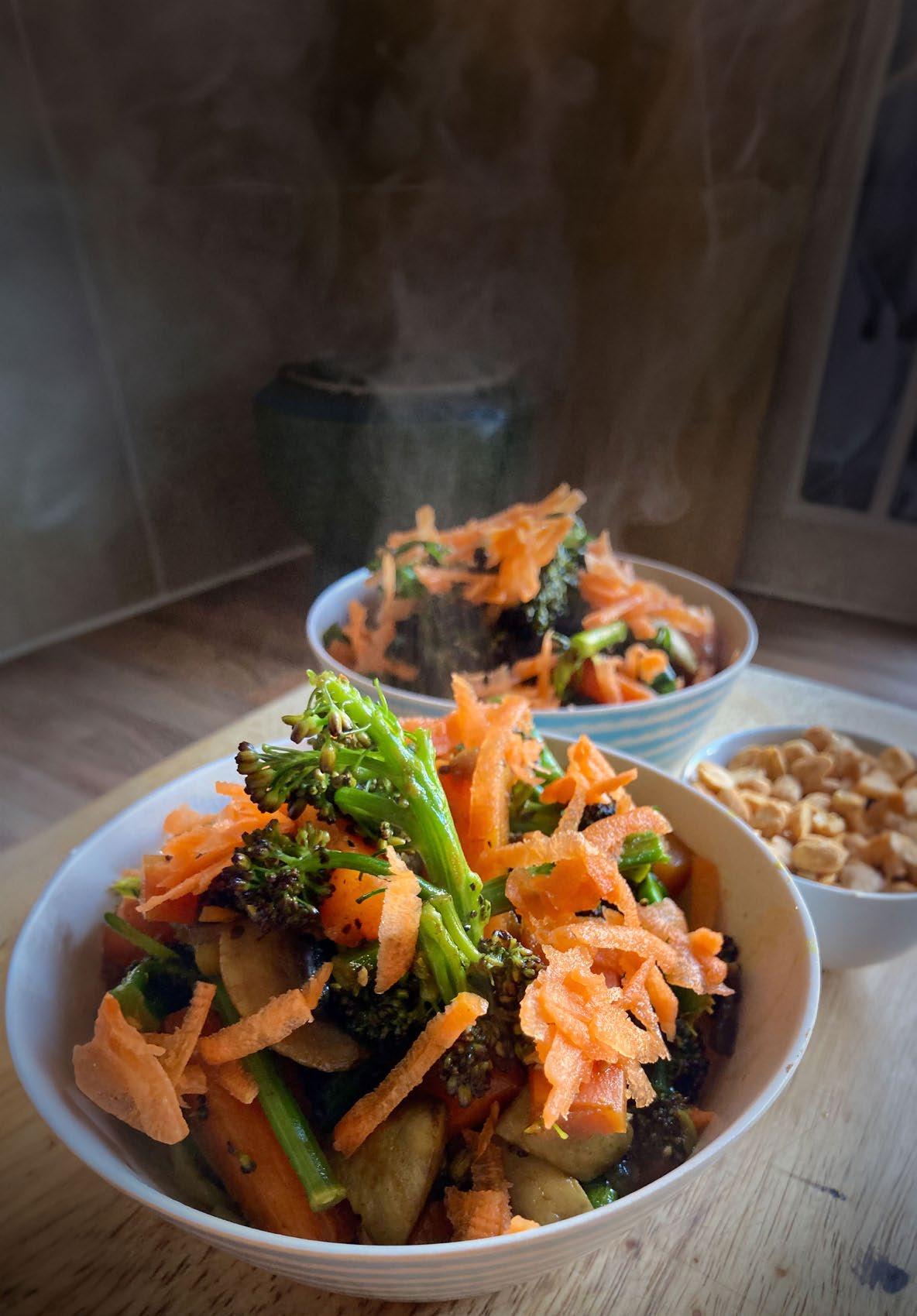 The flavour comes from onion, garlic, turmeric, ginger, soy sauce and a spoonful of honey. We’ve served with a separate bowl of peanuts. See the ‘Sides’ section of our website for the full recipe and details on how we put this together.