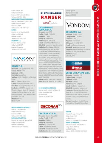 Buenos Aires Km 284 Código Postal: S2124 Localidad: Villa Gobernador Galvez Teléfono: (0341) 317-9000 DAEWOO ELECTRONICS CORPORATION Dirección: Libertador 6223 Piso 12 Of 7 Código Postal: C1428ARF Localidad: C.A.B.A. Teléfono: (011) 4786-6993 / 6055 DAF S.H. Dirección: Av. Del Libertador 2068 Código Postal: B1744 Localidad: Moreno Teléfono: (0237) 468-6704 DAL SANTO S.A. Dirección: Otto Krause 4551 Código Postal: B1667 Localidad: Tortuguitas Teléfono: (03327) 455-400