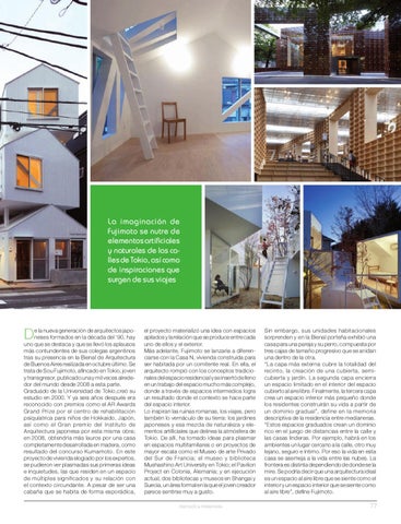 e la nueva generación de arquitectos japoneses formados en la década del ‘90, hay uno que se destaca y que se llevó los aplausos más contundentes de sus colegas argentinos tras su presencia en la Bienal de Arquitectura de Buenos Aires realizada en octubre último. Se trata de Sou Fujimoto, afincado en Tokio, joven y transgresor, publicado una y mil veces alrededor del mundo desde 2008 a esta parte. Graduado de la Universidad de Tokio,creó su estudio en 2000. Y ya seis años después era reconocido con premios como el AR Awards Grand Prize por el centro de rehabilitación psiquíatrica para niños de Hokkaido, Japón, así como el Gran premio del Instituto de Arquitectura japonesa por esta misma obra; en 2008, obtendría más lauros por una casa completamente desarrollada en madera, como resultado del concurso Kumamoto. En este proyecto de vivienda elogiado por los expertos, se pudieron ver plasmadas sus primeras ideas e inquietudes, las que residen en un espacio de múltiples significados y su relación con el contexto circundante. A pesar de ser una cabaña que se habita de forma esporádica,