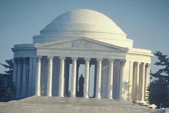 is supported by Ionic columns. The focal point of the interior space is a 19-foot-tall bronze statue of Jefferson. Panels on the white marble walls are inscribed with some of his most significant writings. Paddle boats can be rented along the Tidal Basin’s eastern shore.