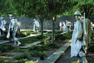 MEMORIAL is near the Lincoln Memorial. It was erected in gratitude to the 1.5 million American military personnel served in Korea from 1950 to 1953. The most striking aspect is the Field of Service, a group of stainless-steel statues depicting a squad of American soldiers on ground patrol. It is the 19 poncho-clad soldiers— representing the U.S. Air Force, Army, Marines, and Navy and different ethnic backgrounds—that convey a feeling of wariness and the unknown.
