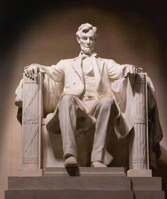 LINCOLN MEMORIAL is aligned with the United States Capitol and the Washington Monument. It honors a man whose personal life was marked by tragedy and disappointment, even as he led the nation through its greatest test, the Civil War. This stately structure is supported by 36 massive Doric columns representing the states in the Union at Lincoln’s death. Dominating the interior is a colossal, seated statue of Lincoln, carved from 28 blocks of Georgia marble. Two of Lincoln’s famous speeches—the eloquent Gettysburg Address and his Second Inaugural Address—are carved on the south and north walls. Looking east toward the Washington Monument from the top of the memorial steps, the expansive panorama takes in the 2,128-footlong Reflecting Pool.